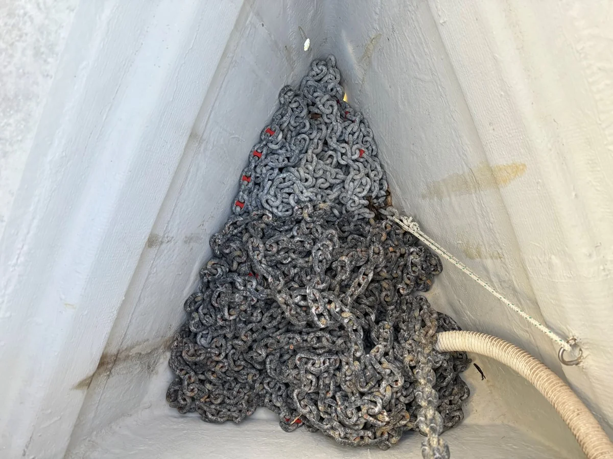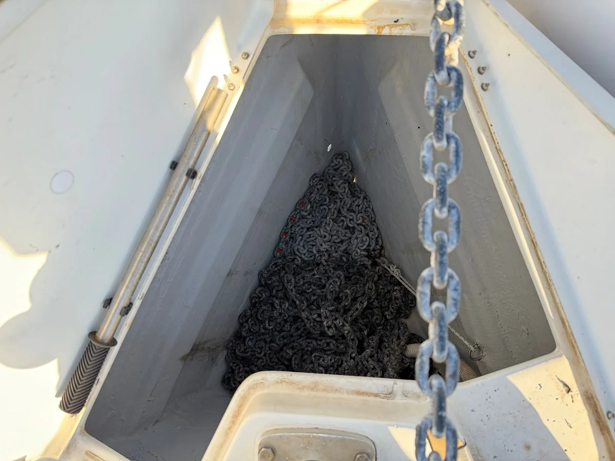 50 m anchor chain, synthetic teak deck, fenders and mooring lines