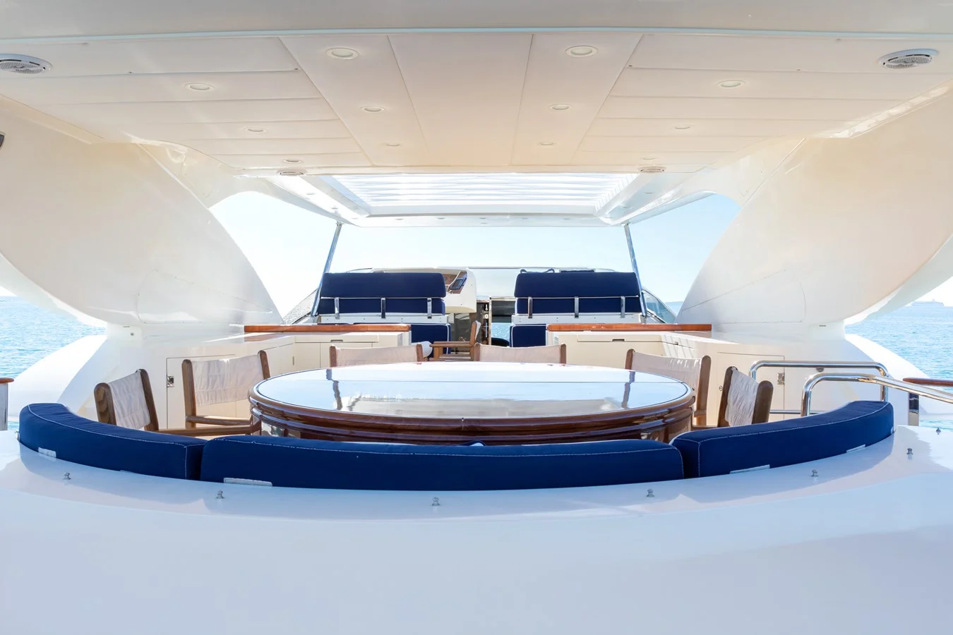 On the exterior, B TWO offers multiple areas for relaxation and entertainment. The sun deck features built-in sofas around coffee tables, a secondary helm station at the bow with additional seating, a semi-circular dining area under a hardtop, and aft sun loungers. The forward deck is ideal for sunbathing, complete with two tiers of sunbeds and a cozy seating area with tables. The aft cockpit serves as the main alfresco dining space, shaded by the flybridge overhang and perfect for meals prepared by the onboard chef.