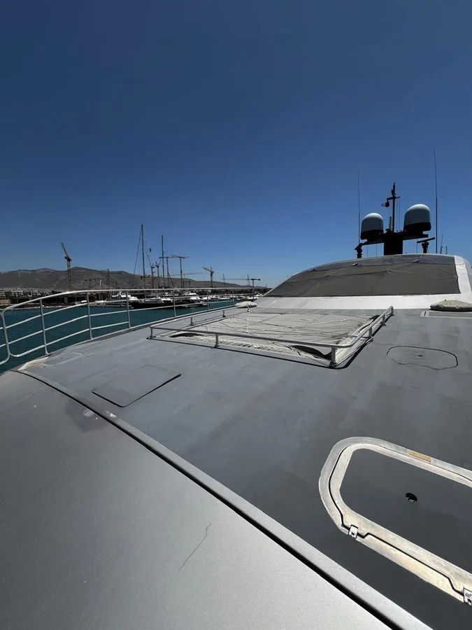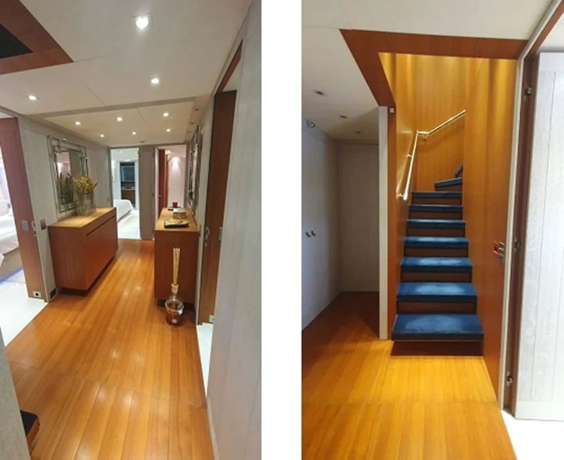 LUCKY ME is the first Wide Body line launched in 2010 from the Italian \nshipyard Cantieri Navali Baglietto. The 42 metre all aluminium motor yacht \nLucky Me reaches a maximum speed of 27 knots, while she can cruise at \n20 knots and was projected to give a range of 800 miles. She is powered \nby twin MTU 16V 4000 M90 engines. \nIconic example of Baglietto Fast aluminium yachts, such as other famous \nunits: Monokini, Apache II and Pachamama, Lucky Me has had two, \nBaglietto experienced owners since new. Francesco Paszkowski is \nresponsible for her beautiful exterior design. She can comfortably \naccommodate 12 people. \nThe interior of this magnificent yacht Lucky Me was also designed by \nFrancesco Paszkowski and refitted by her current owners with the \nassistance of Cadena Design Group. The yacht features a full-beam master \nsuite on the main deck, forward. The Owner’s suite offers a study and a \nseating area, the main bedroom, a dressing room and an en-suite \nbathroom complete with a ‘wellness spa’. \nThe Master Suite of Lucky Me motor yacht also features two balconies, that \nprovide the Owners with a direct contact with the outdoors. Not only that \nthe Master suite feature these balconies, they are also mirrored by two \nother balconies in the main saloon. Lucky Me decor reflects a contemporary \nstyle, elegant yet modern. Teak and white-painted oak are the \npredominant woods for the walls. \n