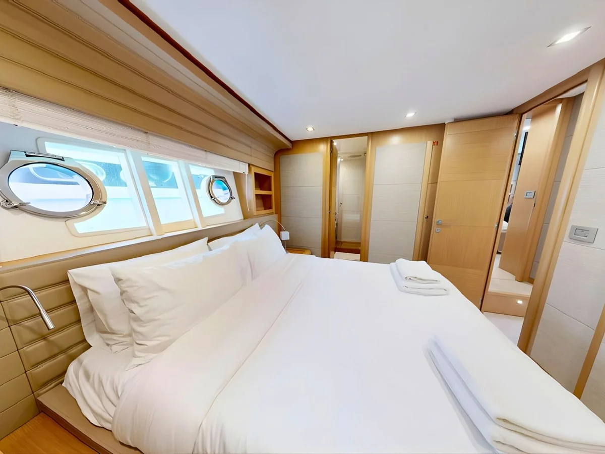 Accommodating 8 guests in four ensuite cabins and three crew members in two separate quarters, she is the ideal motor yacht for both private and commercial use. The generous exterior spaces from the cockpit and the hydraulic swim platform to the impressive flybridge and the bow sunbathing area are combined with interior spaces filled with natural light, not only in the salon, but also in the cabins.