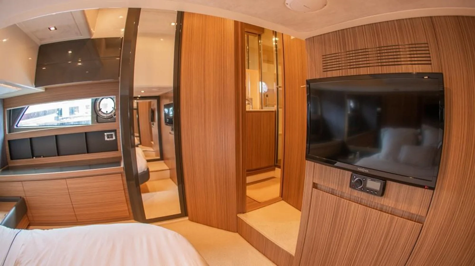 Nothing is left to chance in the master cabin. Every detail contributes to creating an elegant and welcoming ambiance. The measurements: a full beam cabin, with surprising heights. The light: two large windows on the sides brighten up the spaces. The dream: of the big double bed is located at the centre of the cabin. The comfort: a cozy sofa, two full-height wardrobes and an en-suite bath with an elegant shower. The style: elegance of the materials and the utmost attention to every single detail.