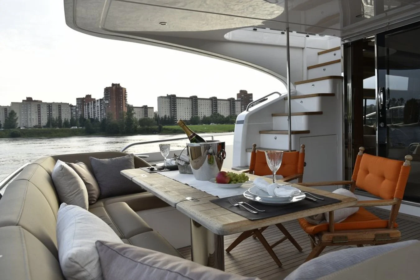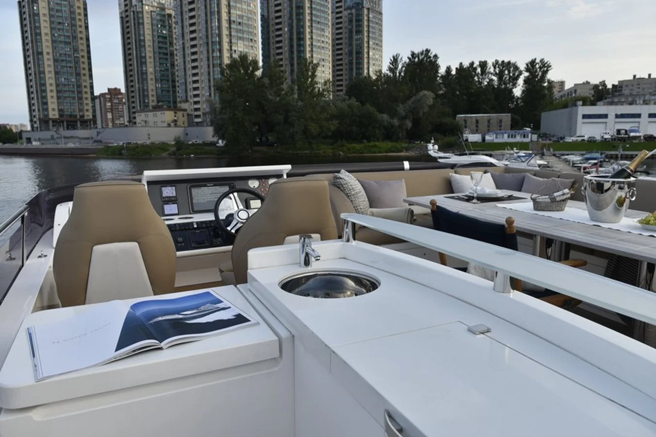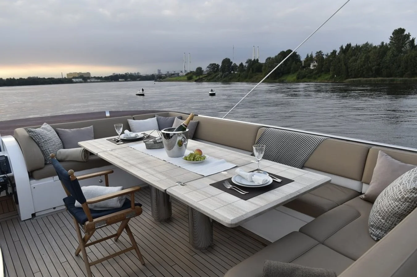 - Non-standard scheme for interior finishing of the yacht elements using Alcantara, as well as beige vinyl instead of standard white materials