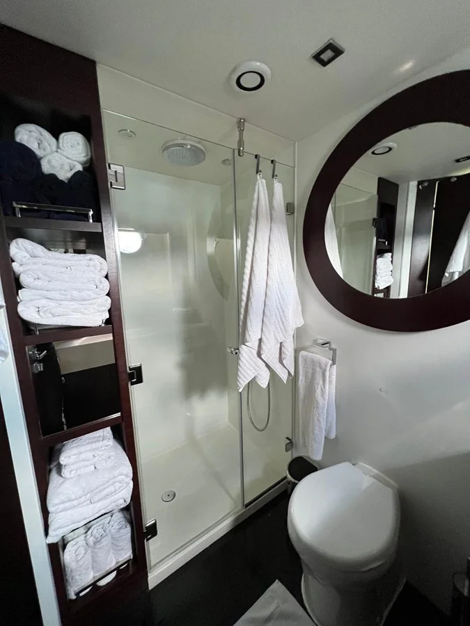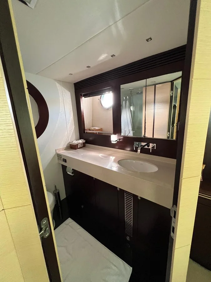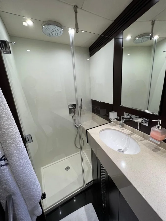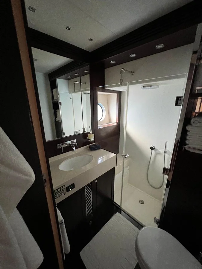 Double berthCupboard and drawer stowage2 x reading lights 24vBedside drawersWalk-in wardrobeOverhead lights LED 24v2 x large windows with opening portholes, mosquito screens and blindsTwo double AC socketsDoor to shower roomFitted carpetSetteeAir conditioning32” televisionBlu-ray/DVD/CD player with speakersHarmon Kardon BDS2 stereo sound system with Apple iPad/iPhone Airport Express wireless connectivity and an Auxil iary HDMI socket linked to AV systemBedlinen - Double bed set of Egyptian White Cotton bed sheets . Comprising of a fitted bottom sheet and flat top sheet with four pillow casesAft En Suite Shower RoomWashbasinTaps and accessoriesHot and cold water supplySeparate shower compartmentElectric toiletExtractor fanMirrored vanity unitShelved cupboardToothbrush and glass holderSoap dispenserTowel ring and towelsOverhead lights LEDOpening porthole with mosquito screen and blindRazor socket 240/110v
