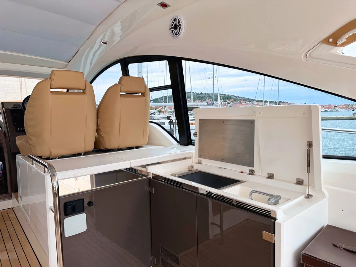 The saloon is equipped with L-shaped seating, which unfolds to provide an additional berth, thanks to the removable table. The galley includes a fridge, stove, and microwave, making it ideal for preparing meals on board.