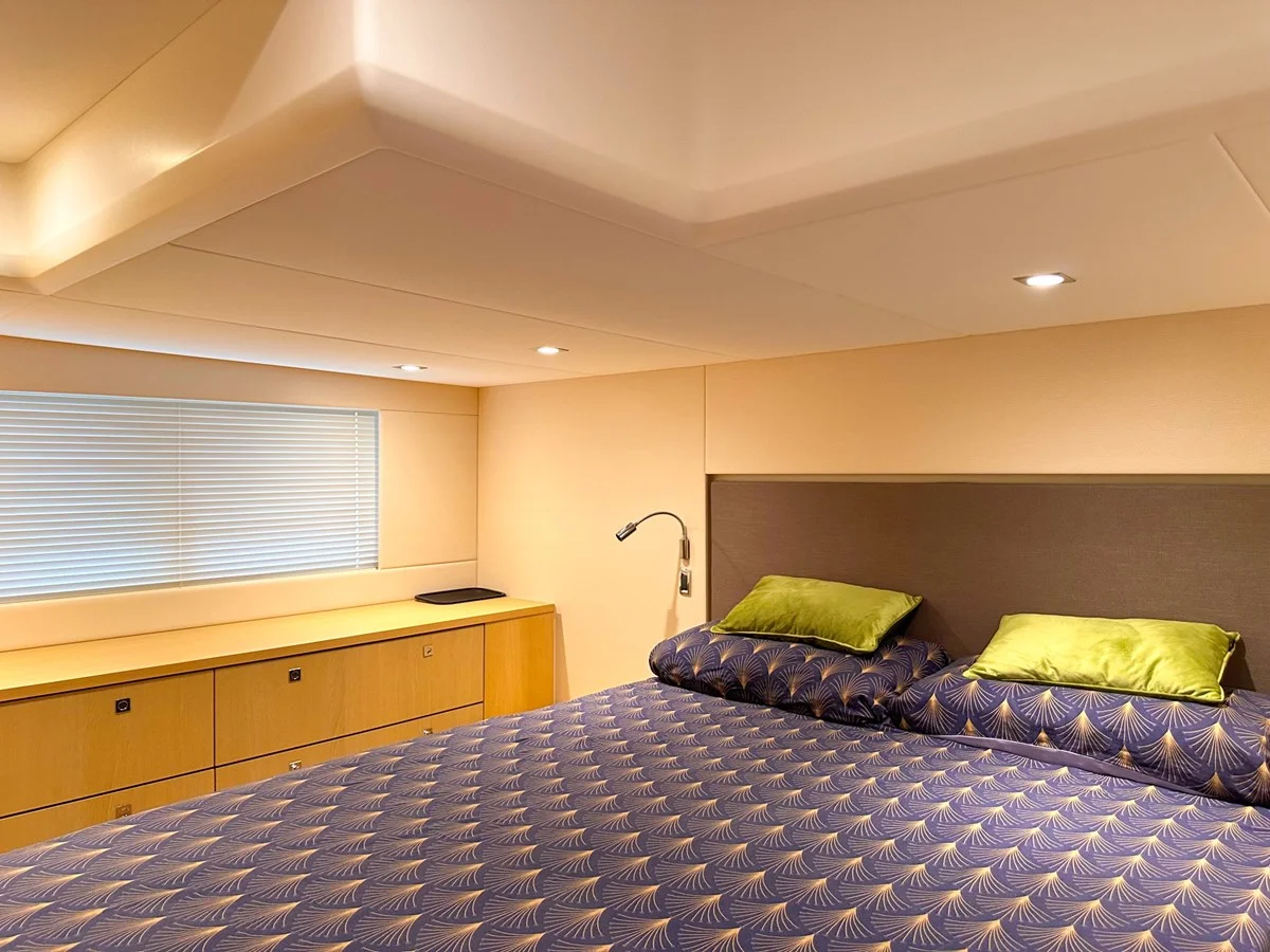 "You and I" offers two guest cabins: a full-beam master cabin with an en-suite and a twin cabin in the bow, which can be converted into a double by sliding the beds together. The twin cabin's bathroom also doubles as a day head for added convenience.