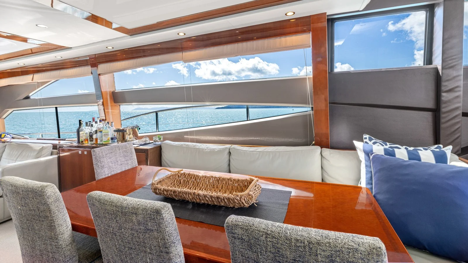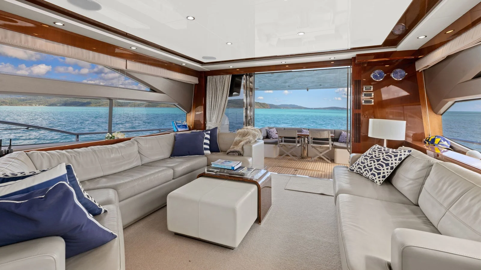 Inside, rich high-gloss timber, premium leather, and European appliances combine with expansive windows to create a bright, refined atmosphere. The yacht features: