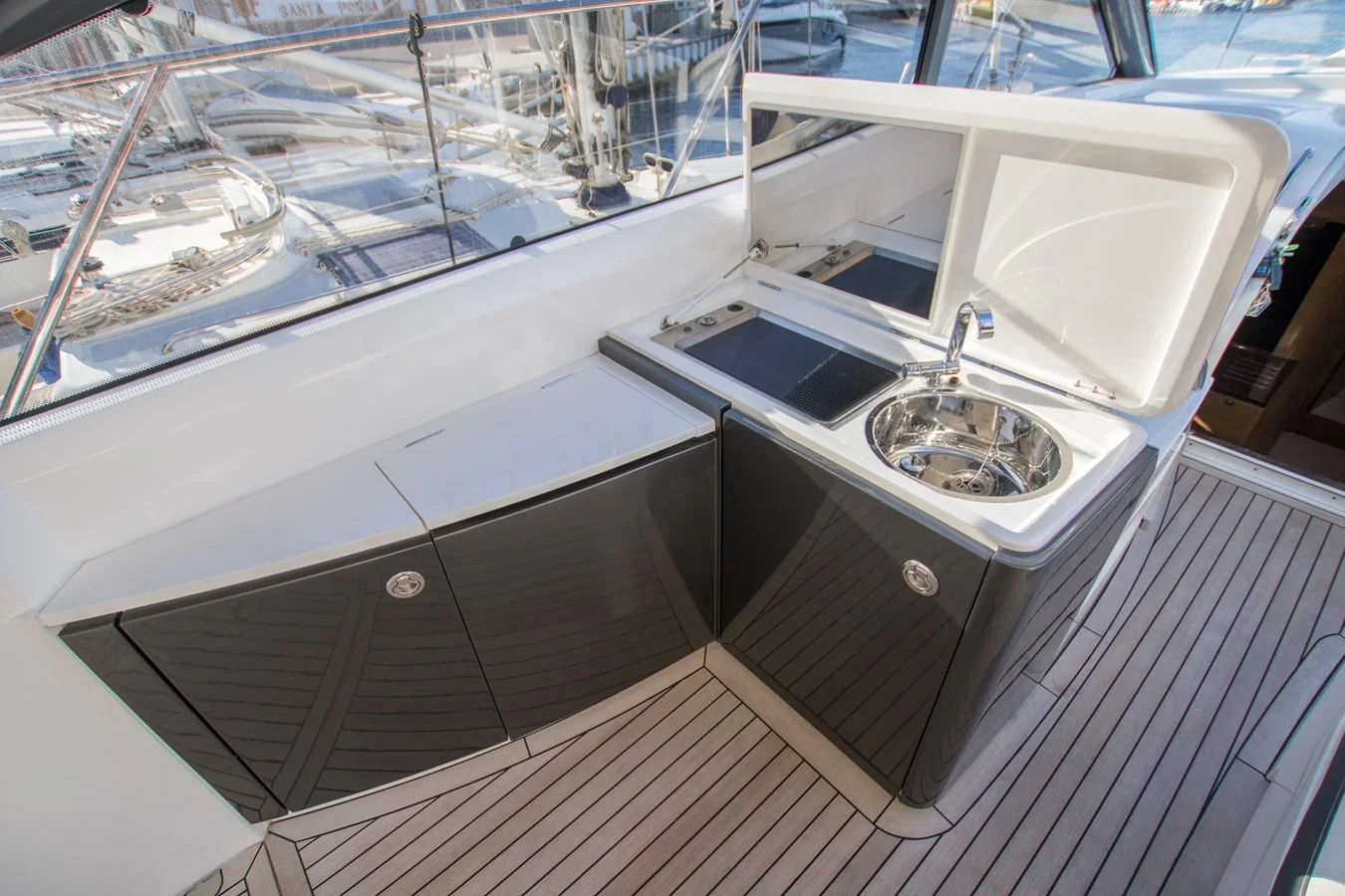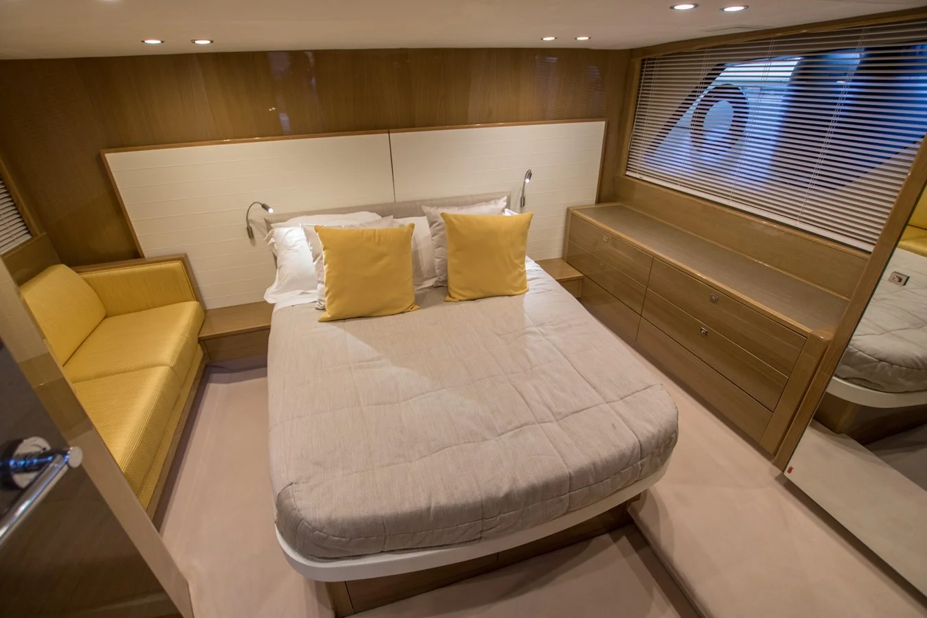 The incredibly spacious teak-laid cockpit, with its generous seating, is shaded by the canopy and electrically operated fabric roof. The cockpit incorporates a wetbar whilst further aft a large integrated sunbed positioned above the tender garage, can accommodate a 3.25m jet-rib. With ease of launch via the electro-hydraulic bathing platform.