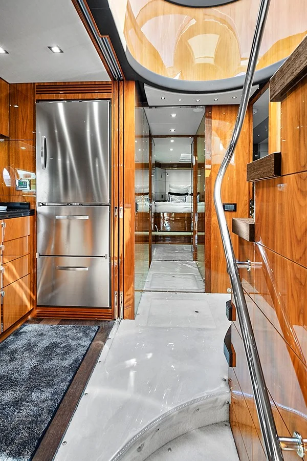 - Lower galley with full size refrigerator, appliances, black granite counter tops and sliding door, separating galley area from lower staterooms