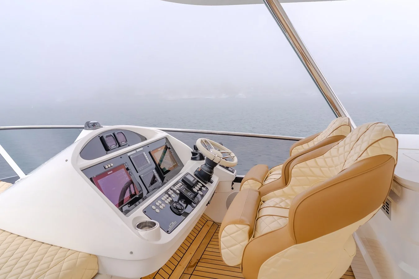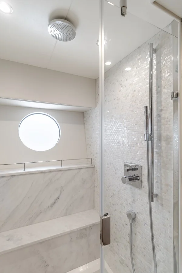 Her open-plan interior with high-gloss wood finishes and pristine white furnishings, creating an airy, elegant atmosphere. The main salon flows effortlessly into a formal dining area, with an adjacent galley ensuring seamless crew service, ideal for entertaining. Zero-speed fin stabilizers guarantee a smooth ride, whether cruising or at anchor.