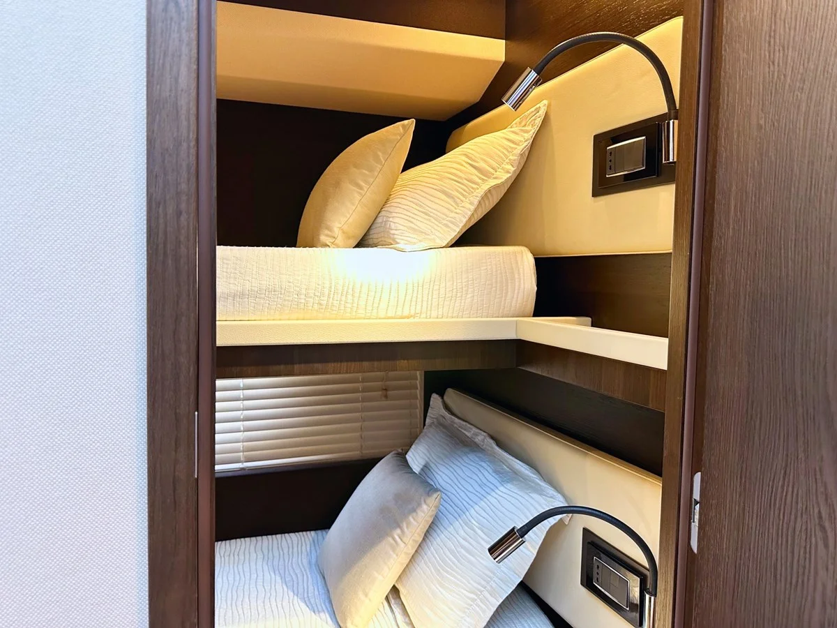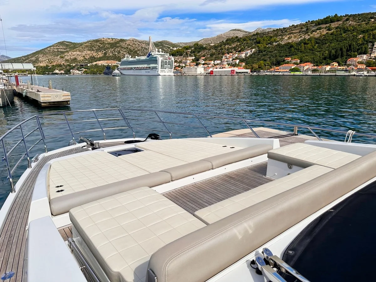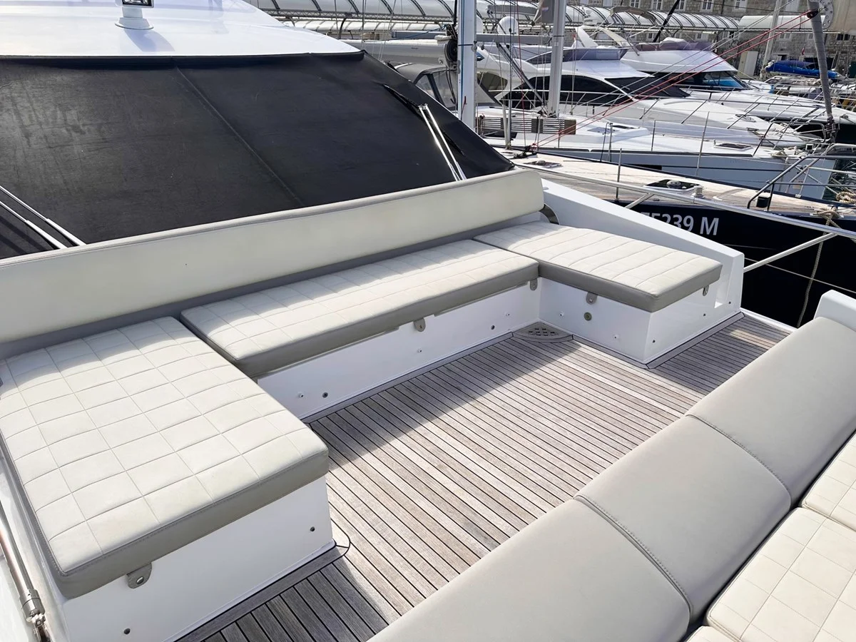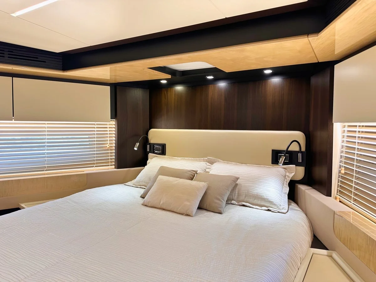 The spacious flybridge is a standout feature, offering a second helm station for easy navigation. With ample seating and a generous table for al fresco dining, this area is perfect for entertaining guests. A grill adds to the appeal, making it an ideal space to gather and enjoy the views.