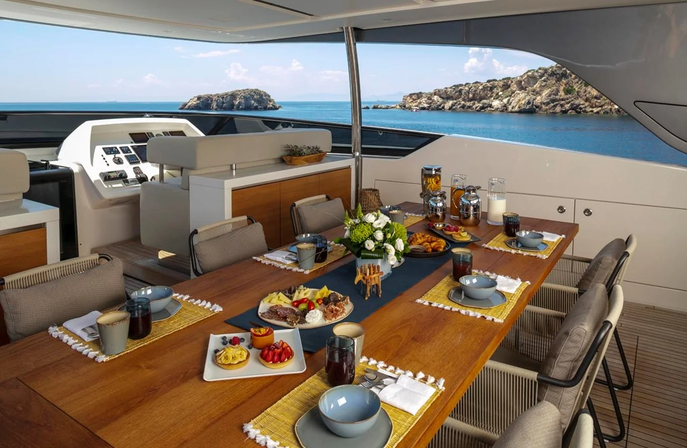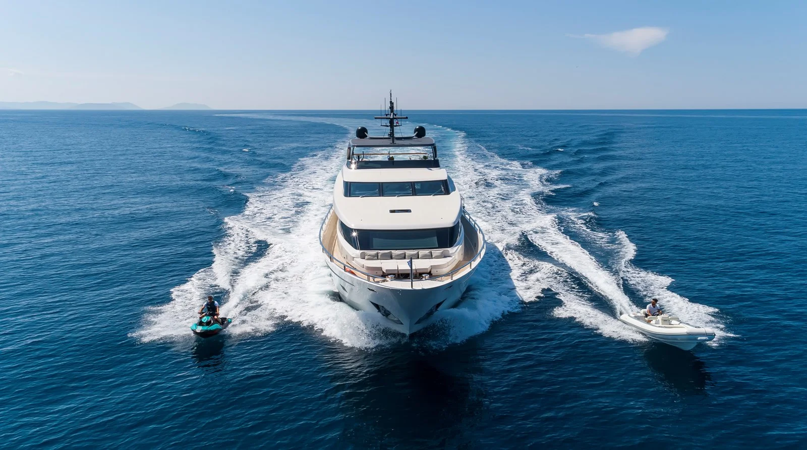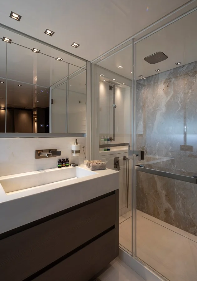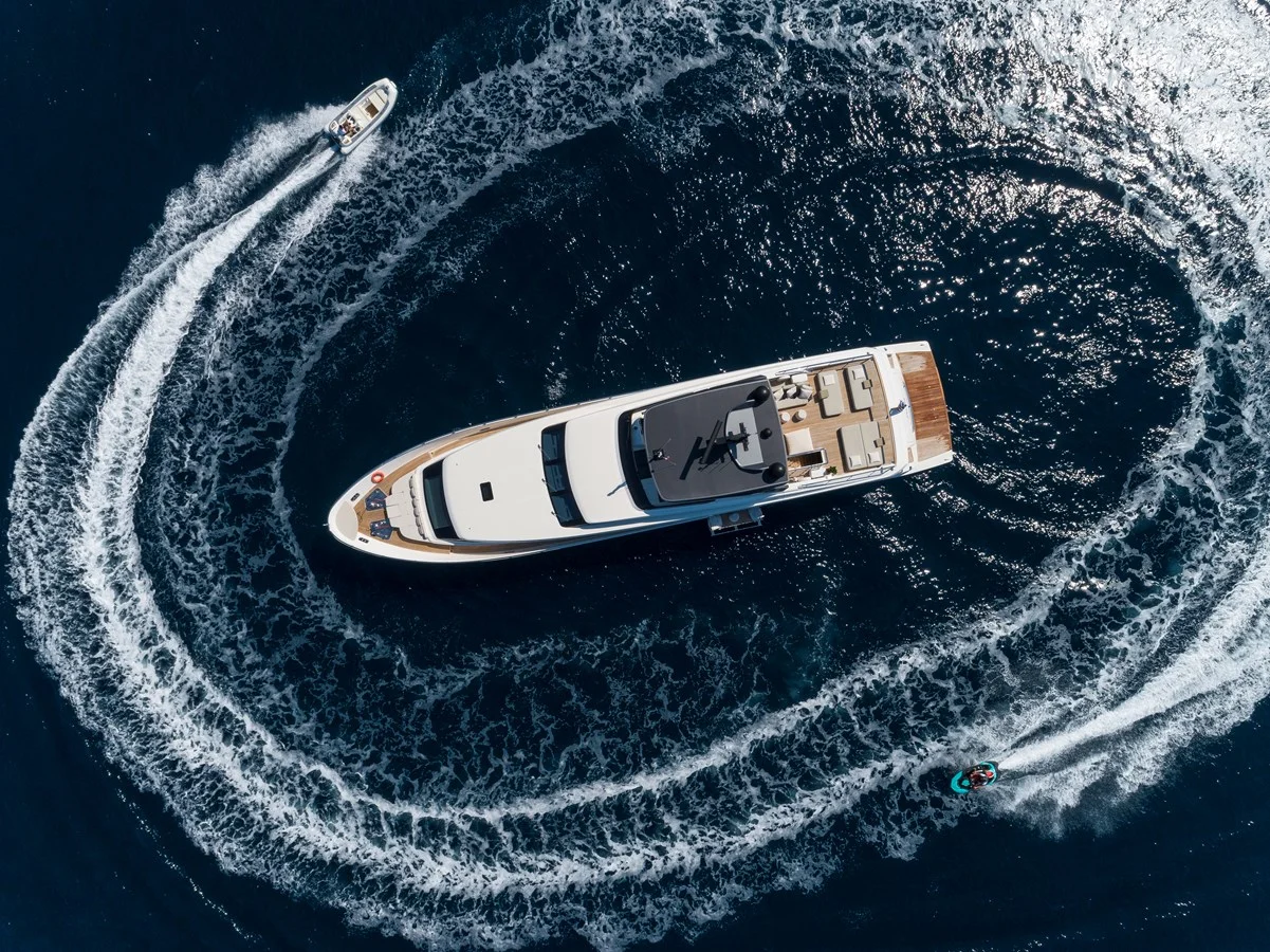 Sanlorenzo SL 106 accommodates up to 10 guests in five exceptionally decorated staterooms. An atmospheric full beam Master suite is located on the Main Deck, featuring huge full height windows, private dressing room, large bathrooms at the same level with the Master suite. Descending to the Lower Deck four lavish suites are brilliantly set. Two VIP cabins with a queen size bed and two Double cabins with king size bed, all with en-suite facilities. The elegant and spacious main salon features finely grained woods, luxurious fabrics, eco-friendly materials and tasteful decorative elements offering a contemporary aesthetic with a hint of opulence. Gorgeous and comfortable, the dining area is wisely designed to host friends and family gatherings, where masterfully tailor made cuisine is served. Dominated by harmonious lines and balanced proportions exterior areas encase a vast selection of versatile outdoor living, dining, and entertainment. Her panoramic Sun Deck plays host to a chic area, bar and large sunbeds whilst the Bridge Deck is ideal for relaxation and casual BBQ al fresco dining with a spacious seating area. San Lorenzo SL106 offers a unique leisure experience, from joyful playtime at the beach club consisting of a high engineered swimming platform adjustable to the desired height above or below the water to a vast array of water sports. While the bow lounge area is the quintessence of relaxing .