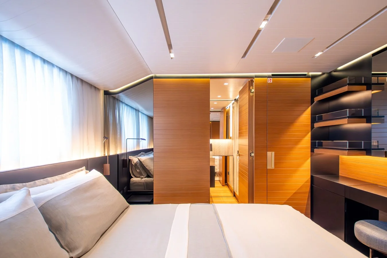 The yacht also accommodates a dedicated crew of five, who are comfortably housed in three well-designed crew cabins. The crew quarters, galley, and pilot house are thoughtfully separated from the guest living spaces, creating a discreet division between service and leisure areas. This smart layout guarantees guests enjoy uninterrupted privacy while benefitting from attentive, seamless service at all times.
