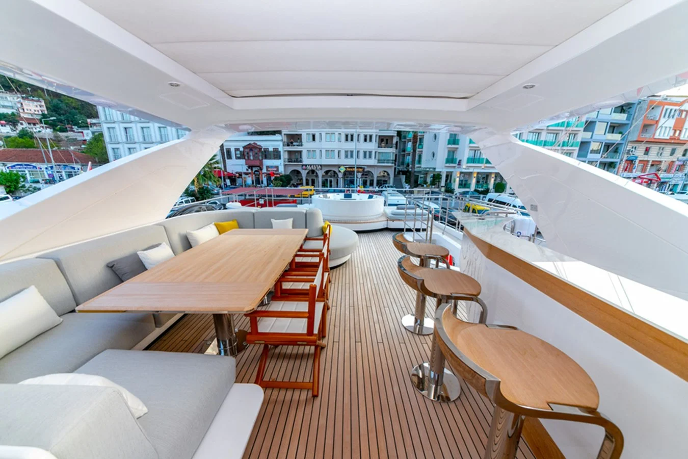 The spacious flybridge offers panoramic views, ample lounging, and an alfresco dining area with a bar. The aft deck provides a welcoming setting for entertaining, while the foredeck sun lounge offers plenty of seating and relaxation areas.