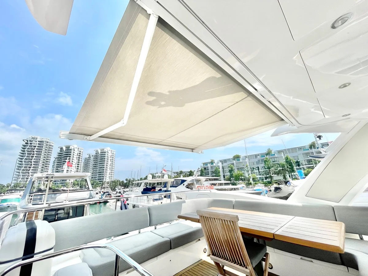 Fully removable black camper canvas enclosure for flybridge (between the hard top/vessel superstructure) to create a huge atrium seating/dining area.