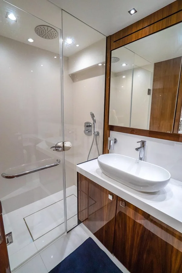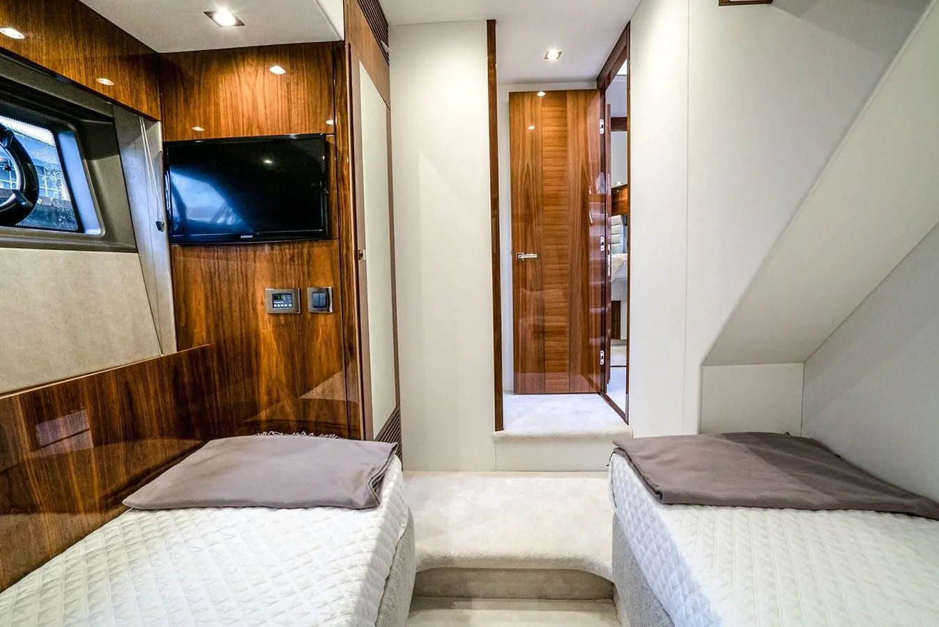 Thanks to the galley being situated on the main deck, there is room enough for four very spacious cabins below including two large twin cabins, a forward VIP suite and standout full-beam master cabin with its own private stairway access from the saloon; a first for Sunseeker in this size range.