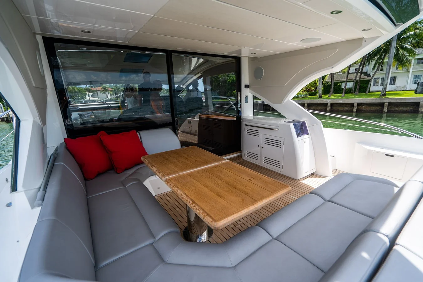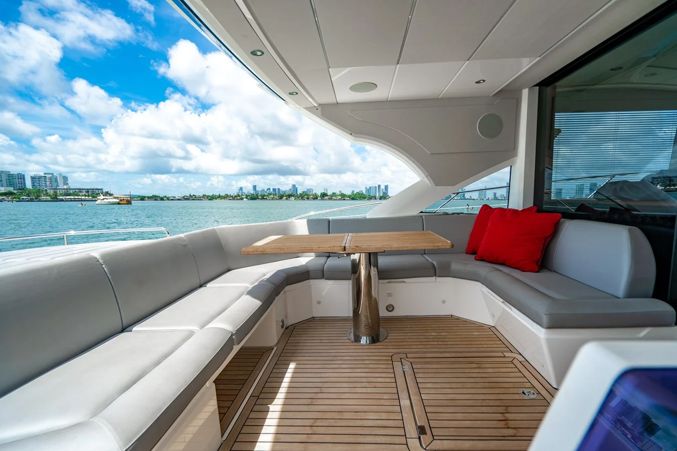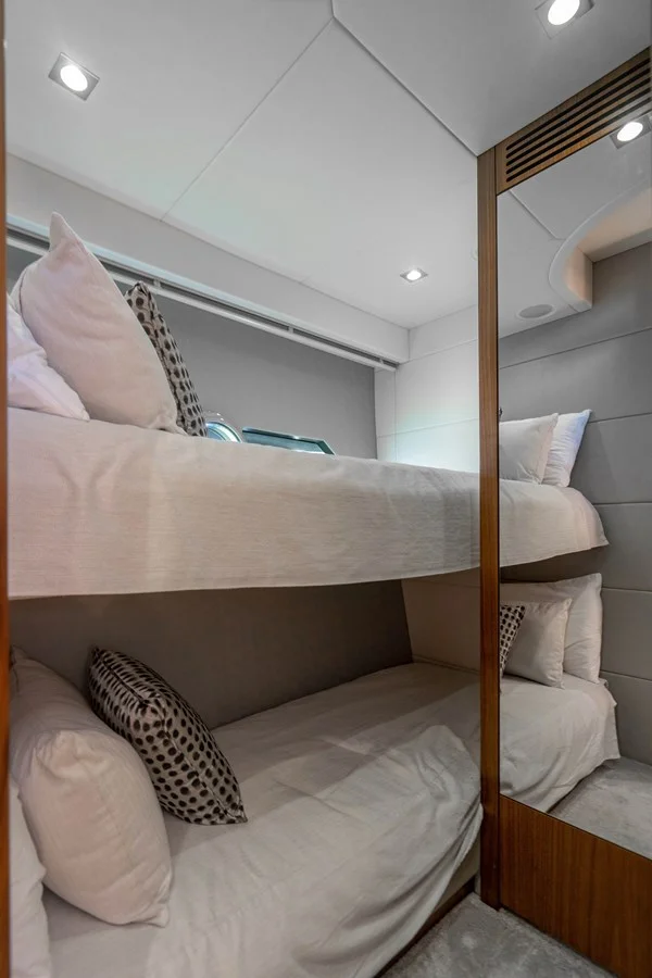 One of the most popular models to be produced by Sunseeker in the past decade, the Predator 57 is sporty, sleek and stunningly crafted to perfectly balance style with practicality. The saloon door sits on hydraulic rams and can be hidden completely in the deck to allow the full use of the large entertainment space seamlessly connecting the interior to the exterior of the vessel. The unique open plan and flexible design of the Predator 57 continues with a fully opening hardtop roof, also a moulded aft cockpit with a large L-shaped seating arrangement and wet bar. Fine and thoughtful design naturally continues to the exterior, with sleek yet oversized mullion-free hull windows to provide light-filled interiors. The Predator 57 cuts a sharp, impressive figure on the open water. Truly a yacht designed for perfect cruising.