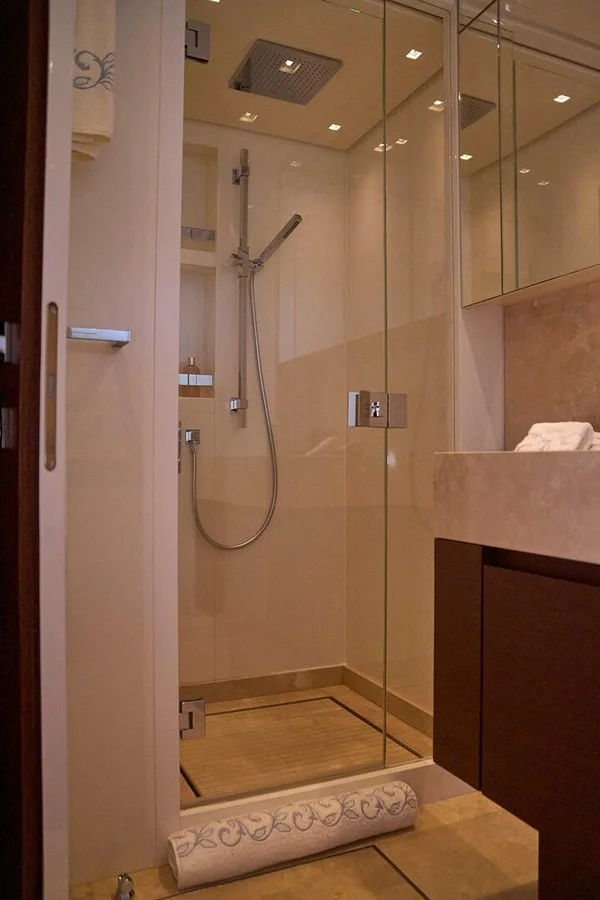 The yacht accommodates up to 10 guests in five suites, supported by a crew of five for a relaxed luxury experience. Built with a GRP hull and superstructure, she is powered by twin MTU 16V 2000 M96 engines, cruising comfortably at 24 knots and reaching a top speed of 28 knots.