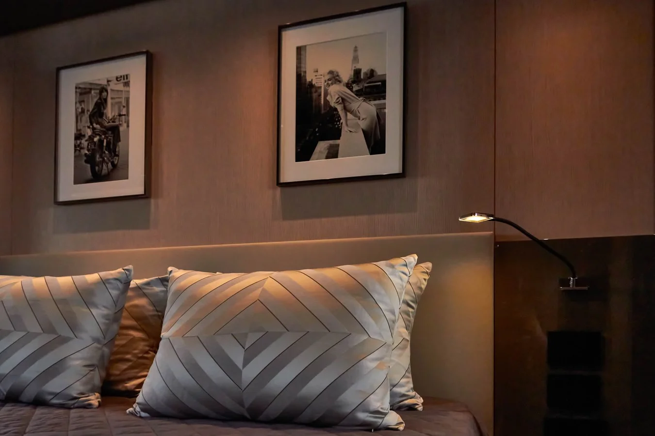 The interior by Zuccon International Project is modern, calm and highly specified, with a Soho-inspired palette combining warm woods, tailored textiles and refined stone detailing. The main salon benefits from full-height windows, bespoke furnishings and a concealed entertainment system positioned behind a Stopsol fumè mirror, while electric decorative shades and lighting controls allow the atmosphere to shift effortlessly from daytime brightness to evening intimacy. This design language continues into the private areas, where Arabescato polished marble introduces a subtle sense of luxury within the Owner’s bathrooms. Throughout the yacht, thoughtful custom joinery, including a reconfigured galley layout, reflects a focus on practical living as much as aesthetic refinement, supporting extended time onboard without compromising design coherence.