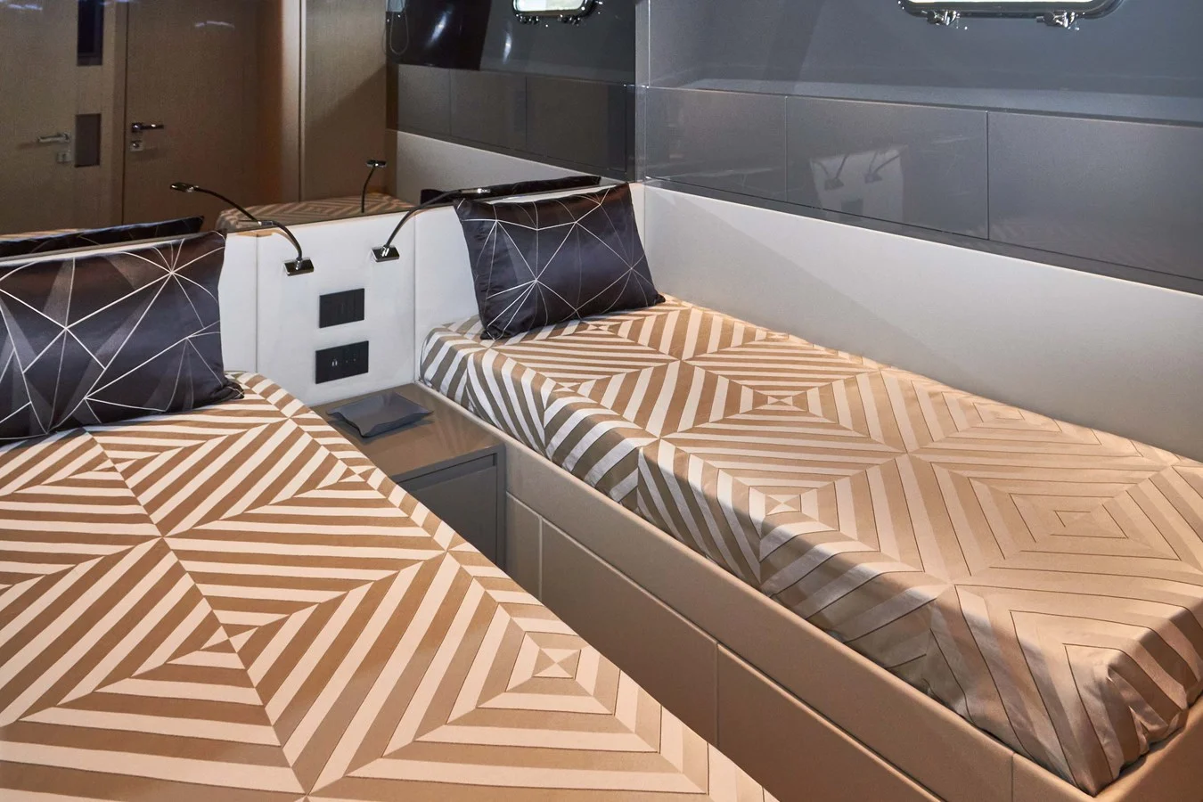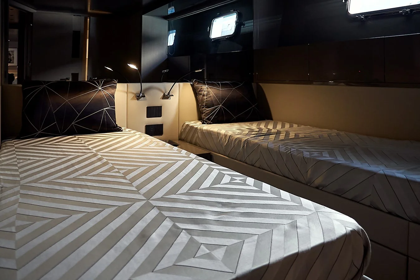 Guest accommodation is arranged for eight across four en-suite cabins, including a full-beam Owner’s suite, VIP and two twin cabins, one convertible. Separate crew quarters for four support discreet, professional onboard service.