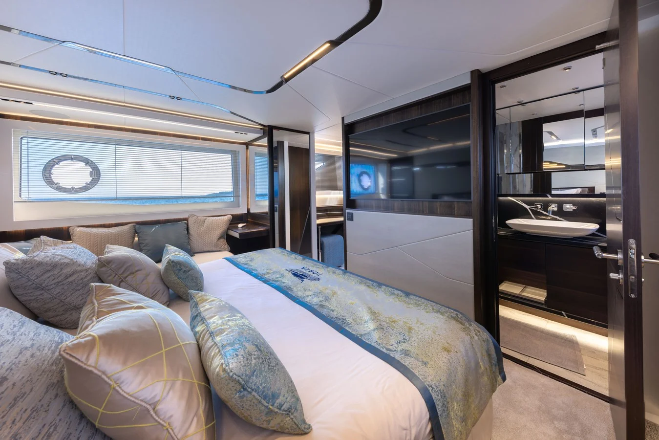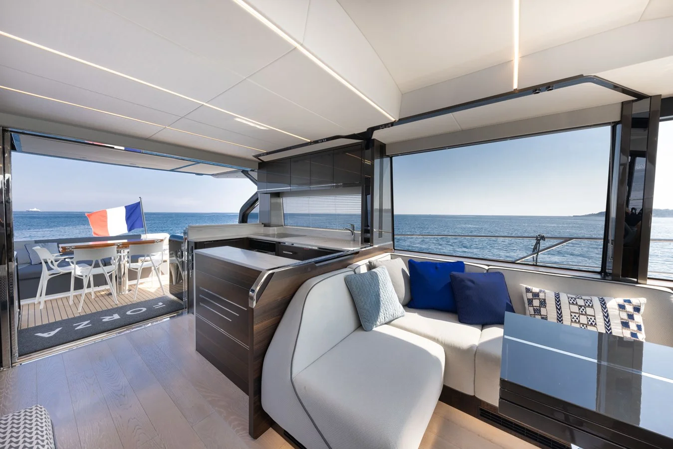 Sunseeker’s dynamic integration of carbon fibre and the latest IPS drives maximises interior volume whilst enhancing performance but it is the integrated SkyHelm that is a revelation; delivering a dynamic helming experience within an almost invisible flybridge profile.