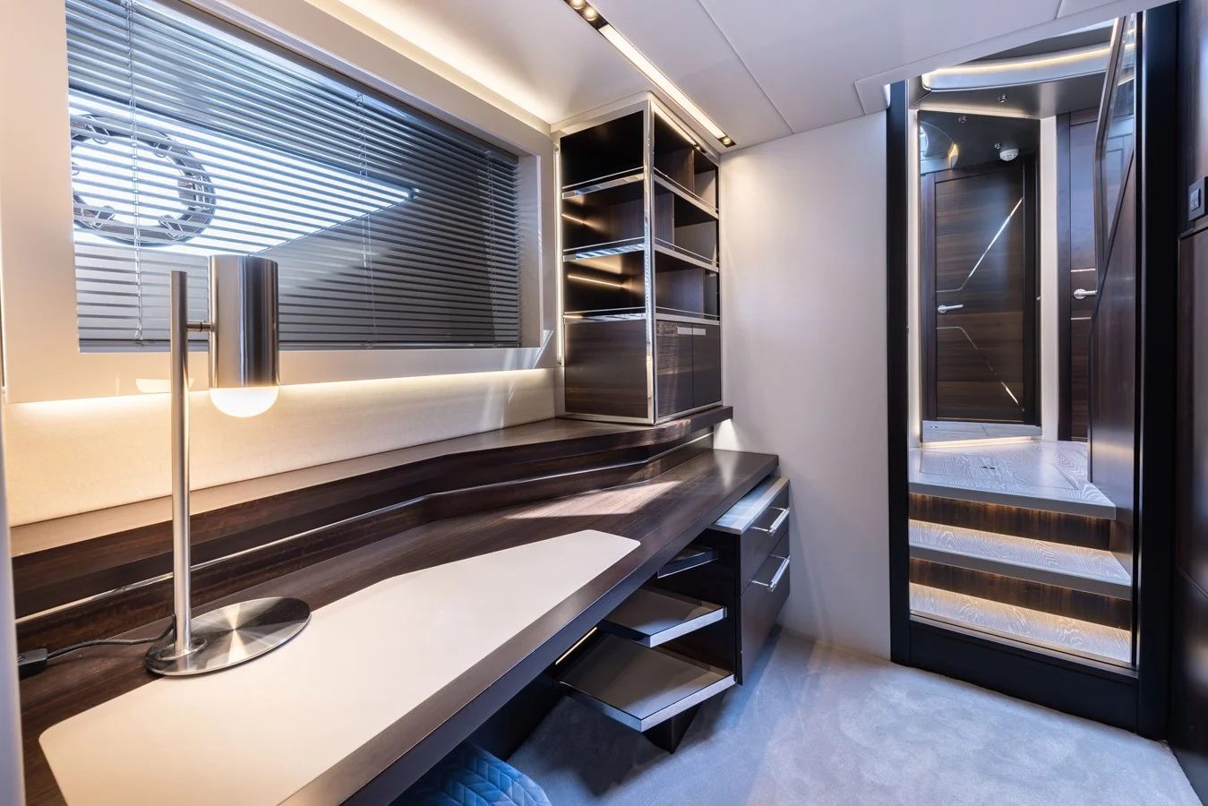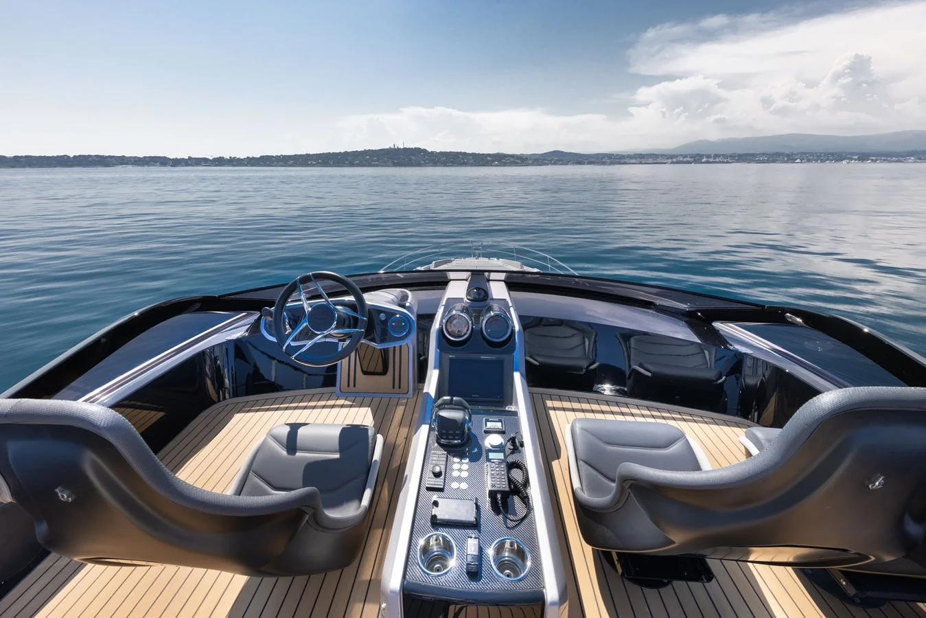 Carbon fibre is used extensively to reduce weight, a key focus for delivering an exhilarating ride with an ability to cut through the water. An infusion of stainless steel accents and rich tinted hull glazing makes for a striking, one-of-a-kind creation.