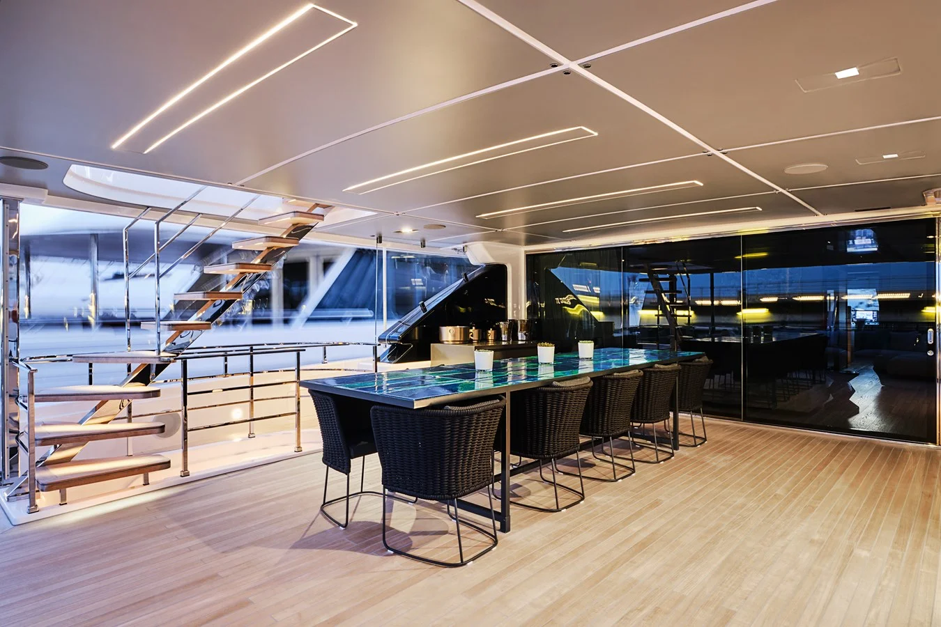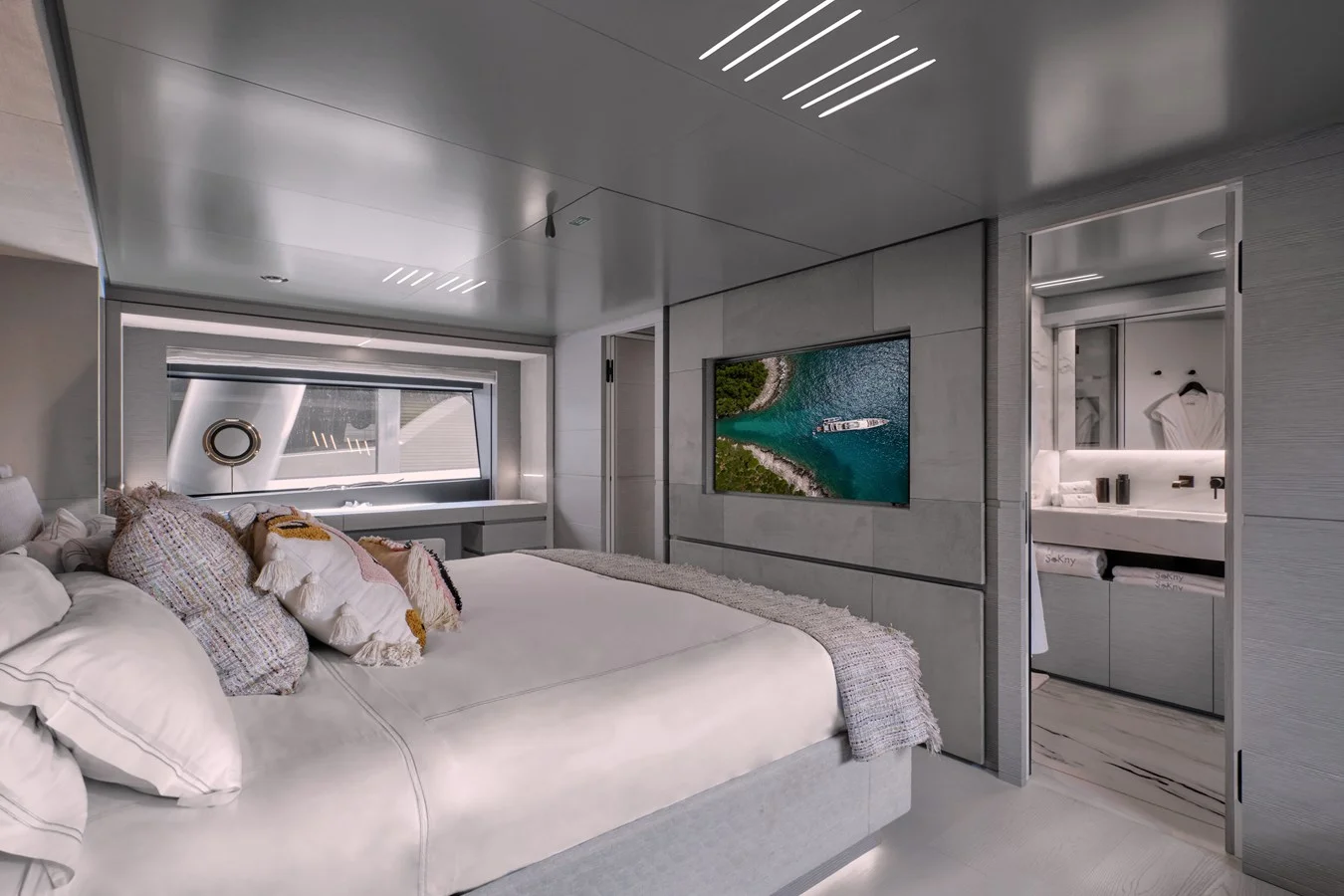 Designed by Zuccon International Project, "M/Y SOKNY" showcases elegance and luxury in every detail. The bespoke interiors, customized with a combination of fine woods and light tones, create a warm and welcoming atmosphere. Large panoramic windows flood the spaces with natural light, enhancing the sense of openness.