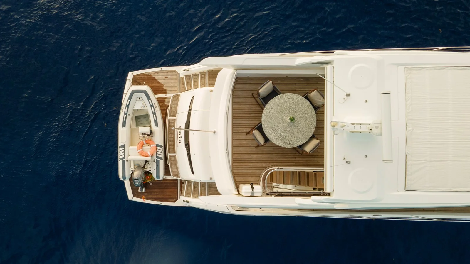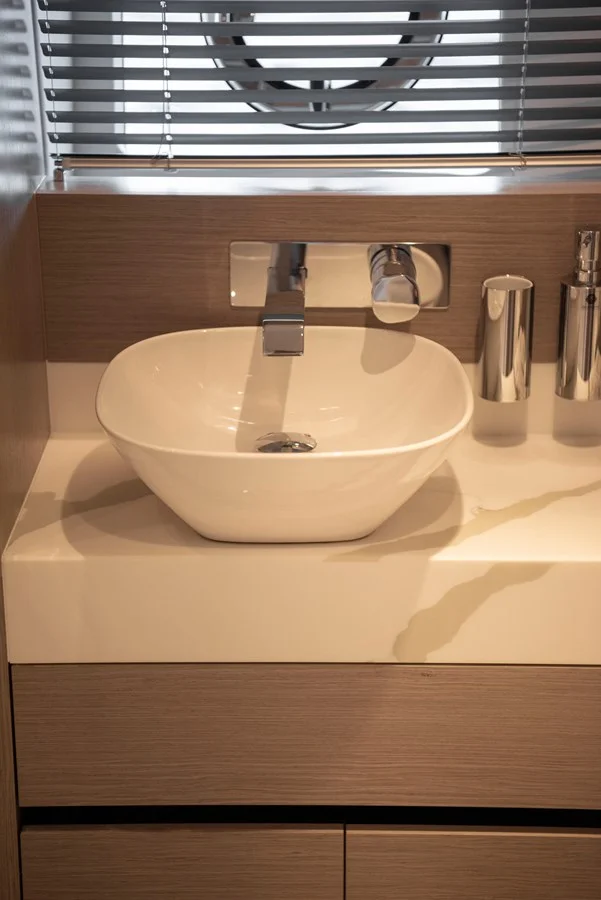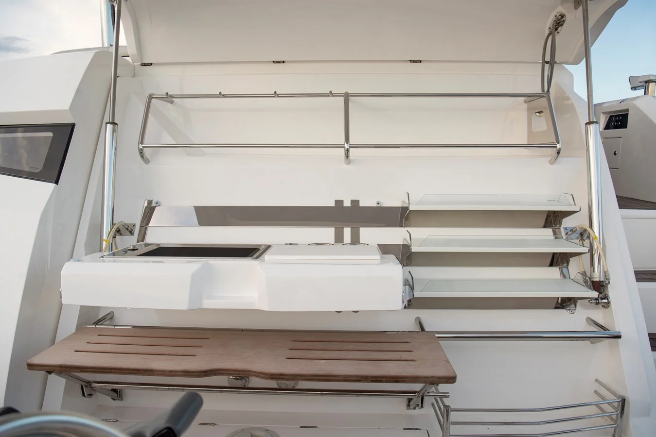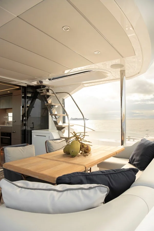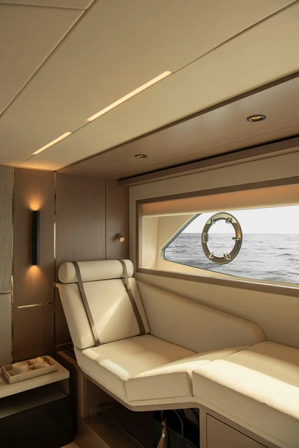 Her “Pacific Edition” layout includes a luxurious grand master stateroom with private lounge area, a custom smoked eucalyptus desk, and opposing saloon sofas with an integrated pop-up TV. A fully equipped upper galley features upgraded Miele appliances, a Vitrifrigo DW360 refrigerator, and a 33-bottle wine cooler.
