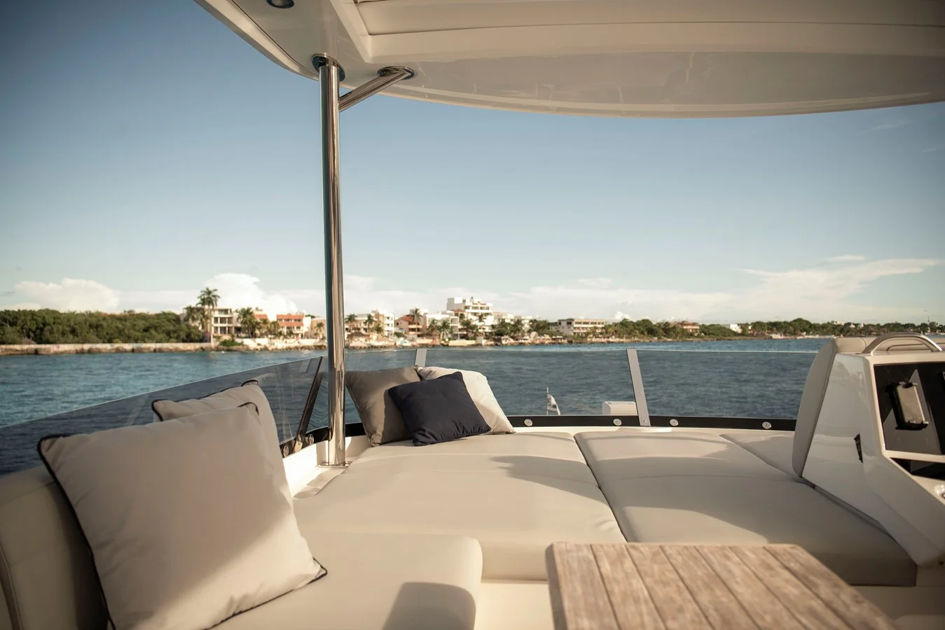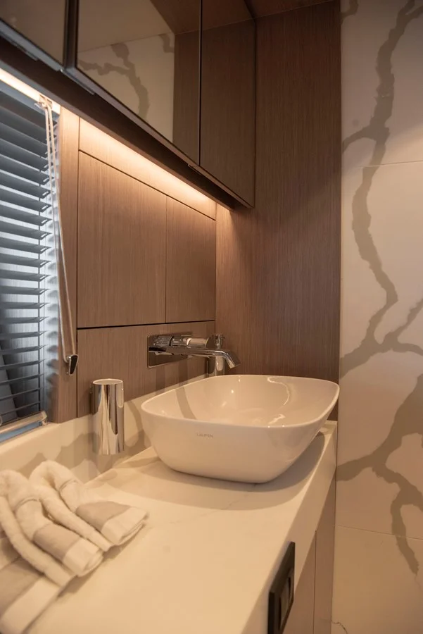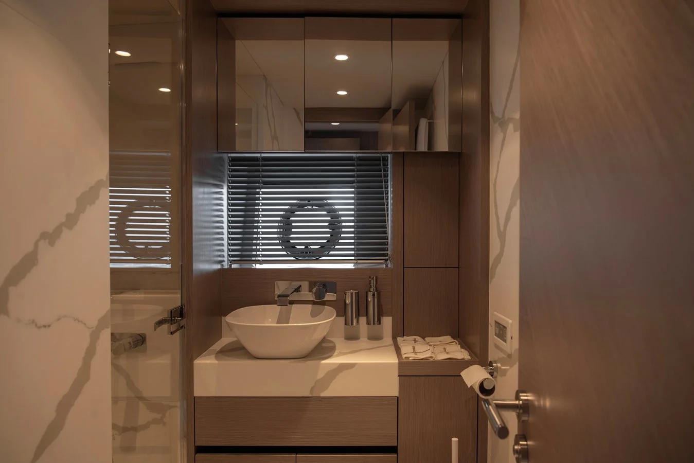 Her “Pacific Edition” layout includes a luxurious grand master stateroom with private lounge area, a custom smoked eucalyptus desk, and opposing saloon sofas with an integrated pop-up TV. A fully equipped upper galley features upgraded Miele appliances, a Vitrifrigo DW360 refrigerator, and a 33-bottle wine cooler.