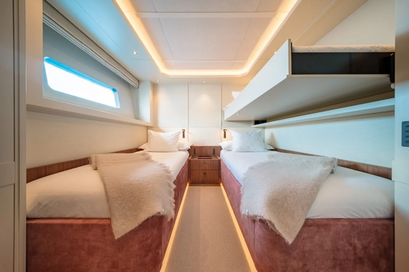 She is powered by twin Caterpillar engines delivering a combined 4,000 horsepower, allowing for a top speed of 16.5 knots and a comfortable cruising speed of 14.5 knots. This exceptional blend of power, performance, and elegance guarantees an unforgettable experience at sea.