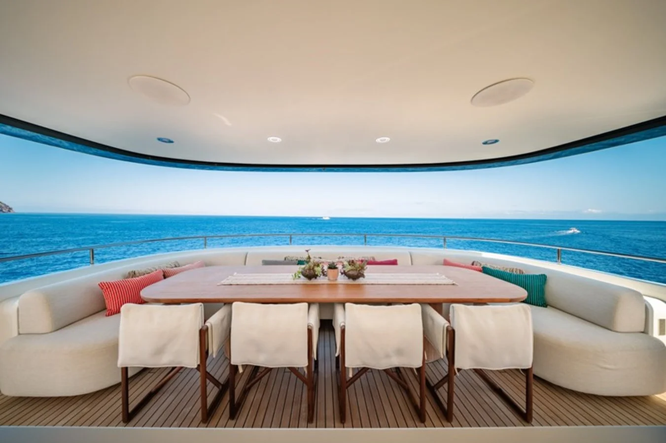 The spacious main deck is home to the large saloon, adjacent formal dining area, a large galley and an impressive master suite with His and Hers bathroom. Outside, main deck aft offers an additional lounge area with stairs leading down to the swimming platform providing easy access to the water.