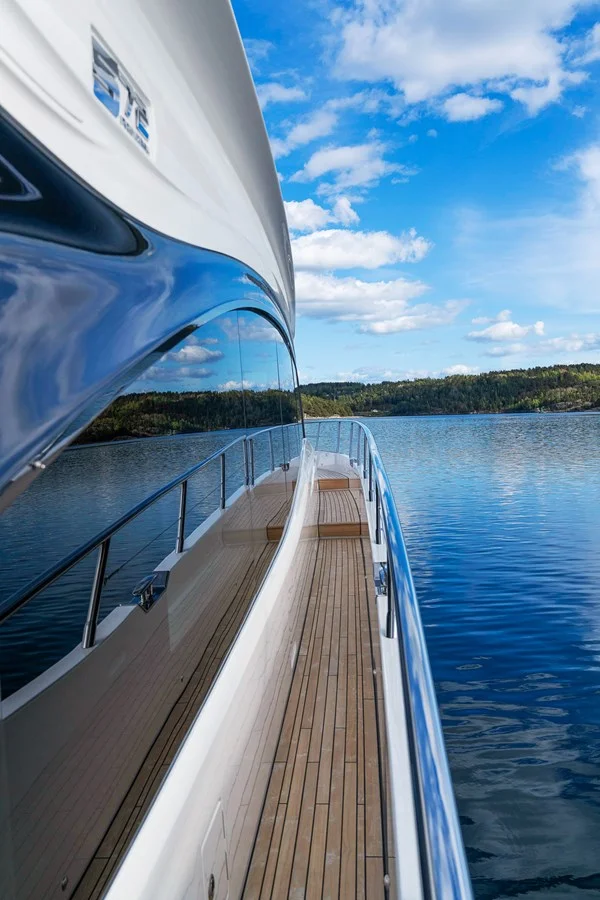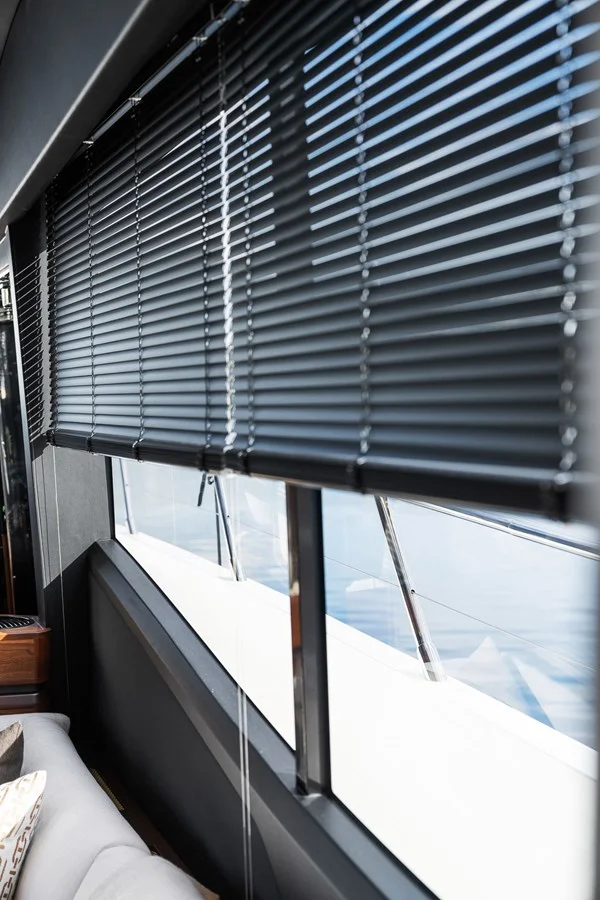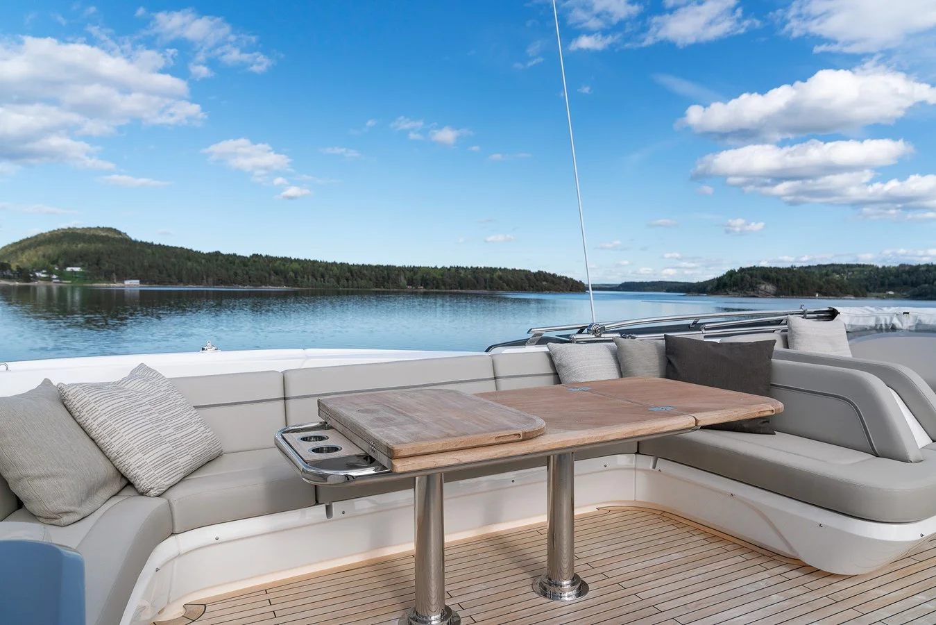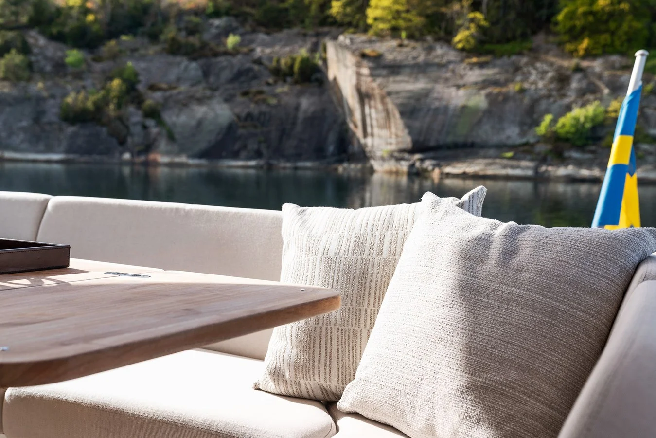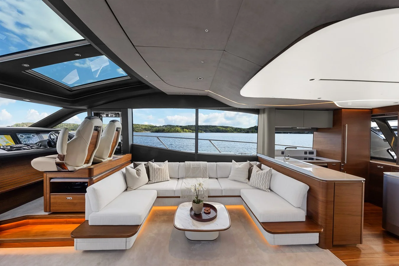 EXTERIOR UPHOLSTERY / CANVAS / COVERSForedeck, cockpit & sportbridge seating with no contrast. Sunbed cushions with contrast insert in Comfort Exterior III Vogue with Vogue/Met or Hitch contrastFit reticulated foam to all standard exterior cockpit, foredeck, and sportsbridge seating/sunpads in place of standard ( to improve drainage, excludes helm seats)Cockpit, foredeck and sportsbridge coversLoose covers for cockpit sofas, sunbed and tableBimini top – Grey canvasAdditional charge for Bimini top to have LED overhead lighting (switched from console)Additional charge for Bimini to be electro-hydraulically powered