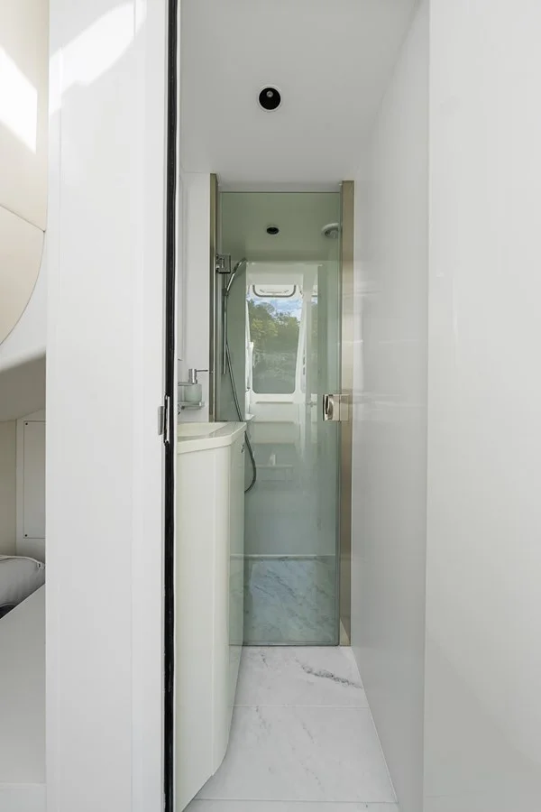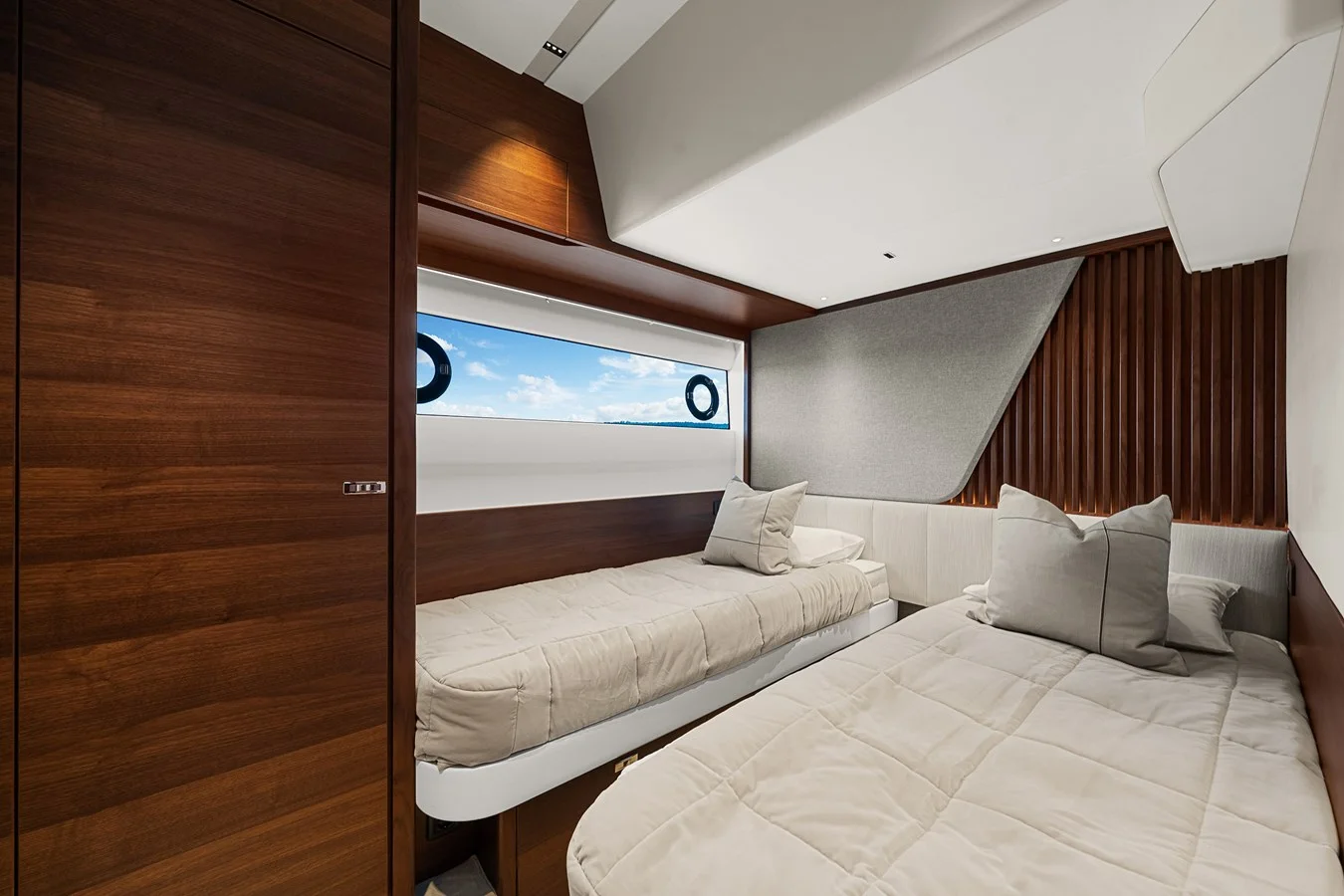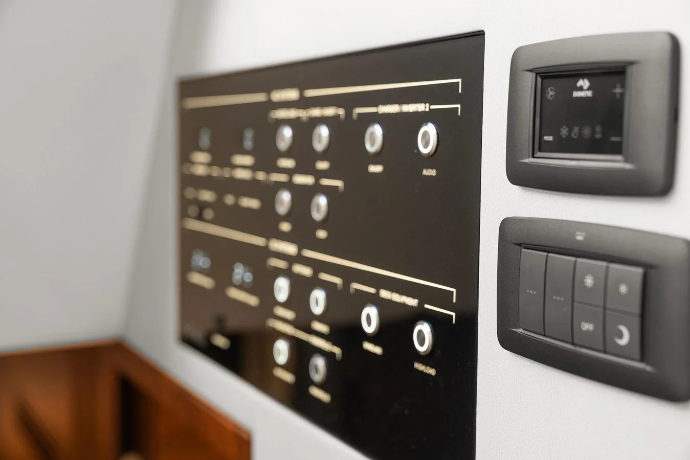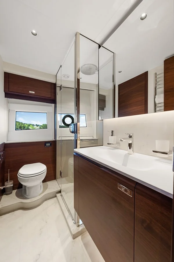 ELECTRICALContinental 220v/240v sockets“Power socket upgrade– Upgrade single sockets in forward cabin to doubles (x2)– Additional single socket with twin USB in port cabin– Additional single socket with twin USB in starboard cabin– Additional single socket in master stateroom– Additional double socket in aft/crew cabin– QI wire/ess charging pad on sportsbridge helm– QI wire/ess charging pad aft of foredeck seating”Underwater transom lights (4x Lumishore THX 803 full colour interfaced with Radar/Chartplotter MFDs)“Heated towel rail in bathroom (each – specify bathroom to be fitted) (Not available in crew bathroom)□ Master Cabin□ Forward Cabin□ PortCabin”“Under floor heating in bathrooms ( each – specify location, excludes shower areas) (Not available in crew bathroom)□ Master Cabin□ Forward Cabin□ PortCabin”Separate washing machine and condenser dryer machine located below stairs leading to Master Stateroom lobby (in place of standard washer/dryer)“lnterior lighting upgrade packageAdditional fibre optics (to saloon & dining area) Additional LED strip lights to blind pelmets – to lower accommodation”“Exterior lighting upgrade packageIncluded linear LED (xl) andfibre optic lighting to the cockpit pelmet and headlining and low levet LED dock lighting (x28)”Electric blinds in lieu of manual Venetian blinds in master stateroom (does not include bathrooms)Electric standard venetian blinds to all main deck windows, excludes patio door & helm areaFreshwater maker (190 litres/hour) with remote instrumentation and service/spares kitCCTV cameras (2 x fixed cameras in engine room, 1 x pan/tilt camera in cockpit)230V socket in garageInverter to socket in galley and TVsShorepower cable and adapter