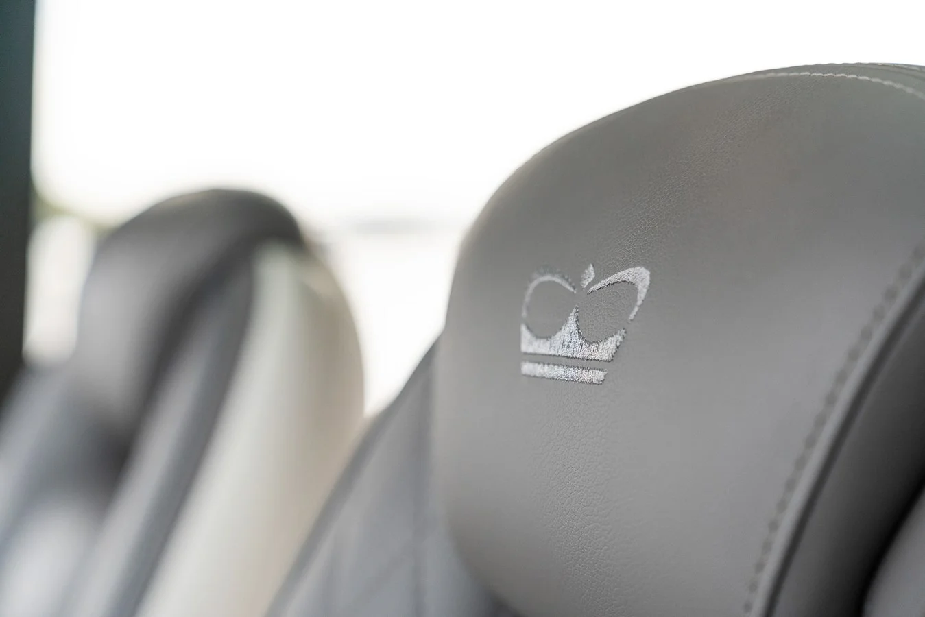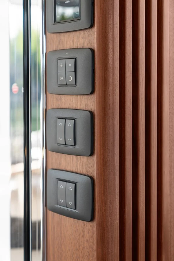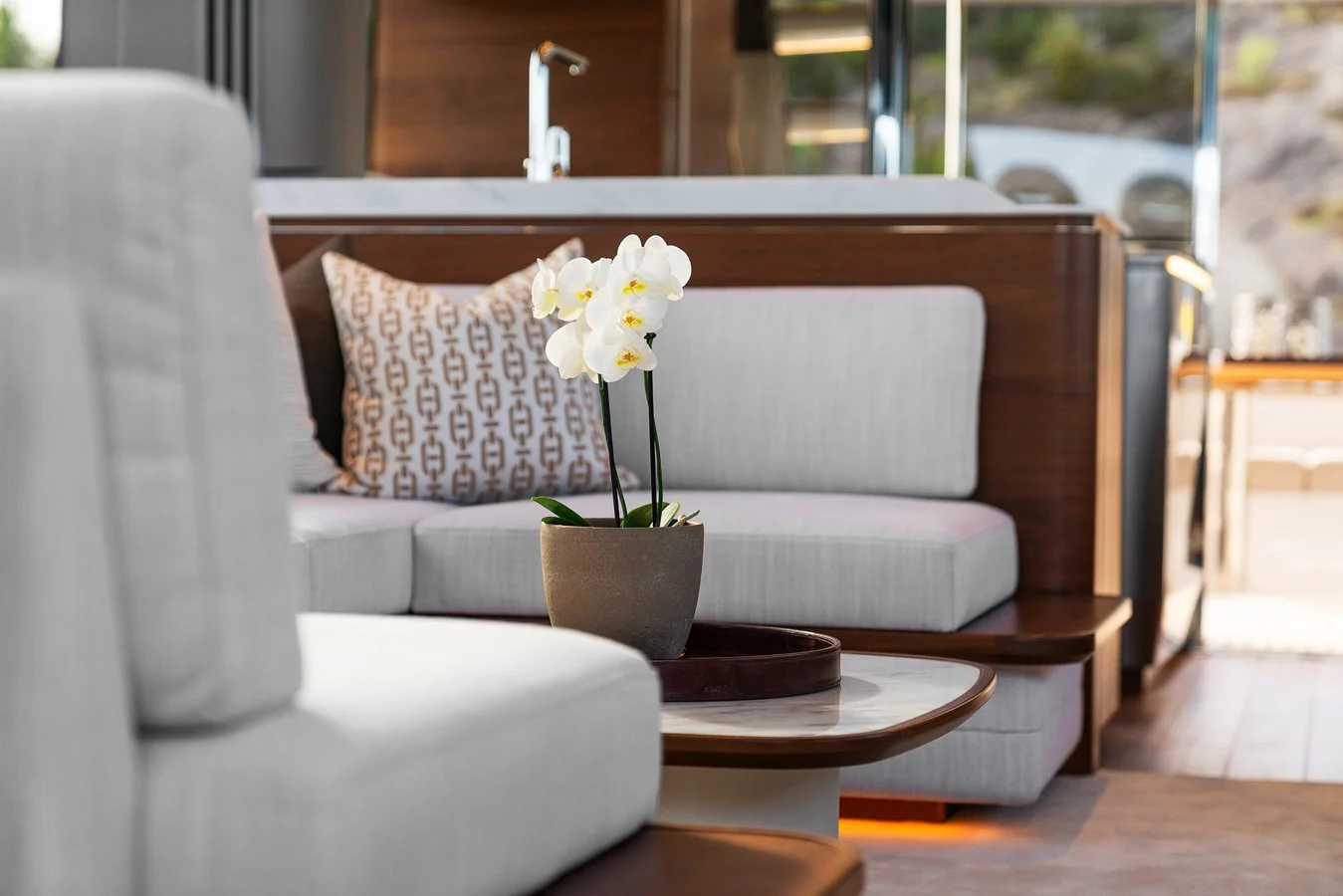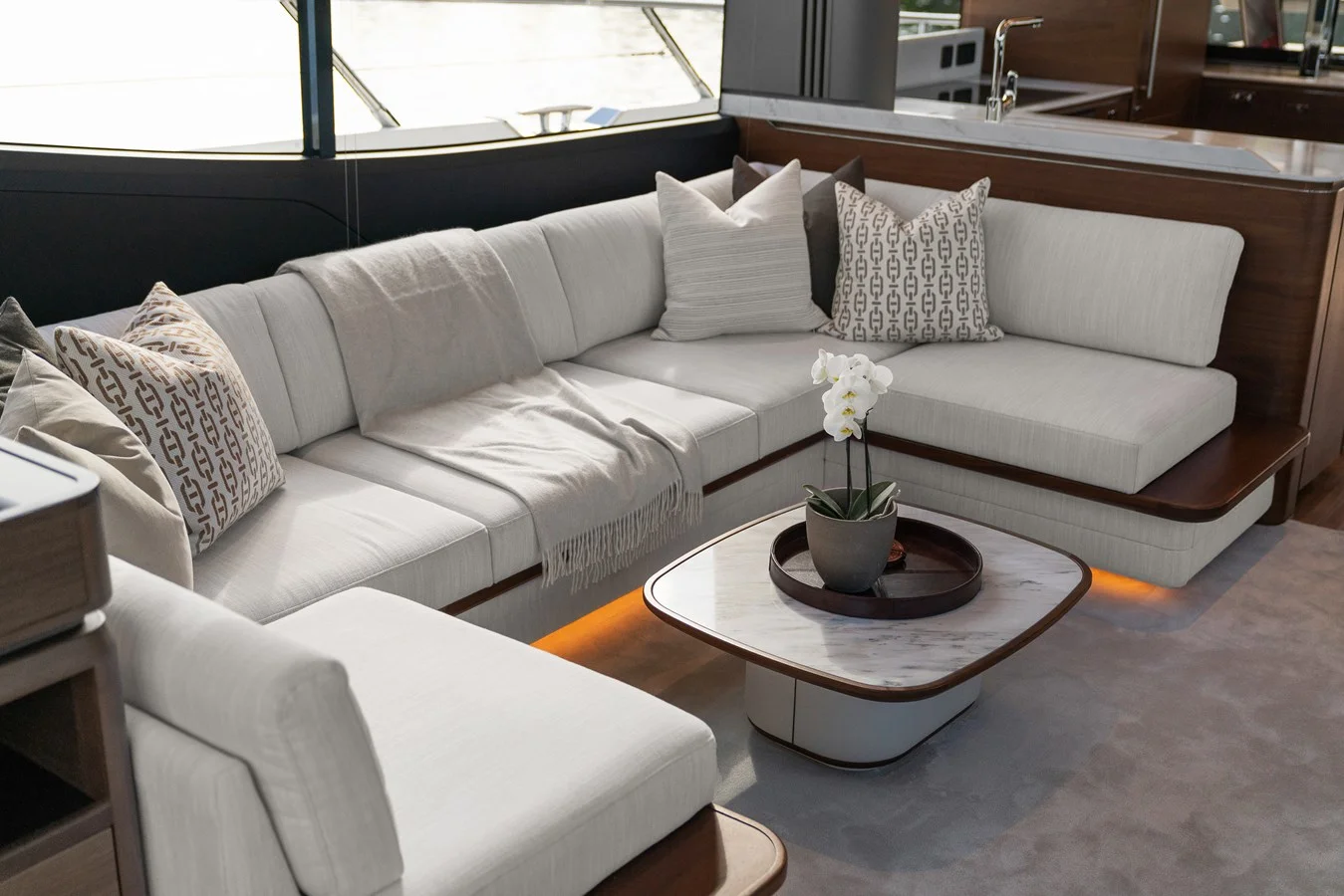 INTERIOR FURNITUREGalley lower units are in boat timber. Top lockers are in Taupe Grey laminate finishWalnut interior wood satin finish (galley, dinette and helm floors are V groove planked walnut as standard)Standard helm console is Grey with helm seats in leatherReplace saloon table with Calcutta Oro Marble top and base in satin walnutDinette table with Majilite Prestige Sand fabric instead of Dekton dark inlaySupply two Savoy Dressing table chairs to dinette