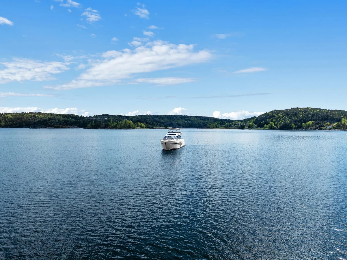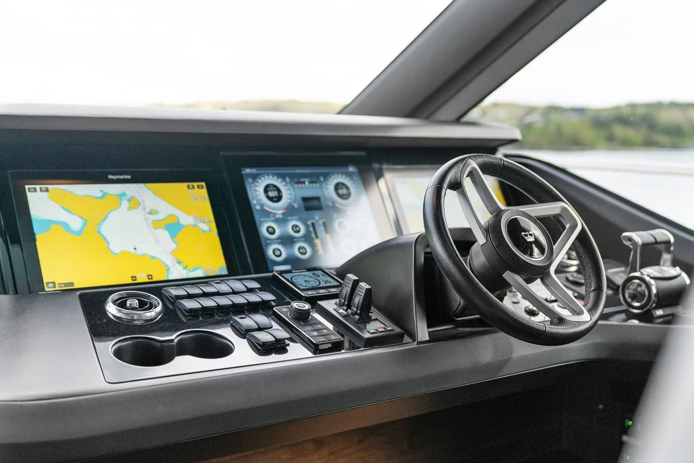 NAVIGATION“Standard navigationsutrustning:Raymarine Axiom XLI 6 multifunction colour display (two at lower helm and one at upper helm) incorporating Radar/Chartplotter with GPS and 4kwSHD 48″” digital colour open array scanner. Raymarine Evolution autopilot with rate gyro with p70Rs control heads and i70s multifunction instruments (for speed, distance, trip, depth alarm, water temp etc) also fitted at both helms”“I x 15″” Boning display at each helm dedicated to Boning system, integrated with the followingfunctionalities: – Engine instrumentation (including fuel levels and fuel flow)– Digital hoat alarms– Lighting controls– AC/DC control & monitoring– CCTV camera display”Additional Raymarine Axiom XLI 6 colour multifunction display at upper helmRemote control keypad (RMK-10) for multifunction display fitted at upper helmRemote control keypad (RMK-10) for multifunction display fitted at lower helmRaymarine Magnum HD colour radar, 12kW pedestal with 48″ open array scannerRaymarine Ray90 Multi Station VHFRaymarine AIS Class B transponder interfaced with chartplotterStern camera connected to plottersNavionics chart
