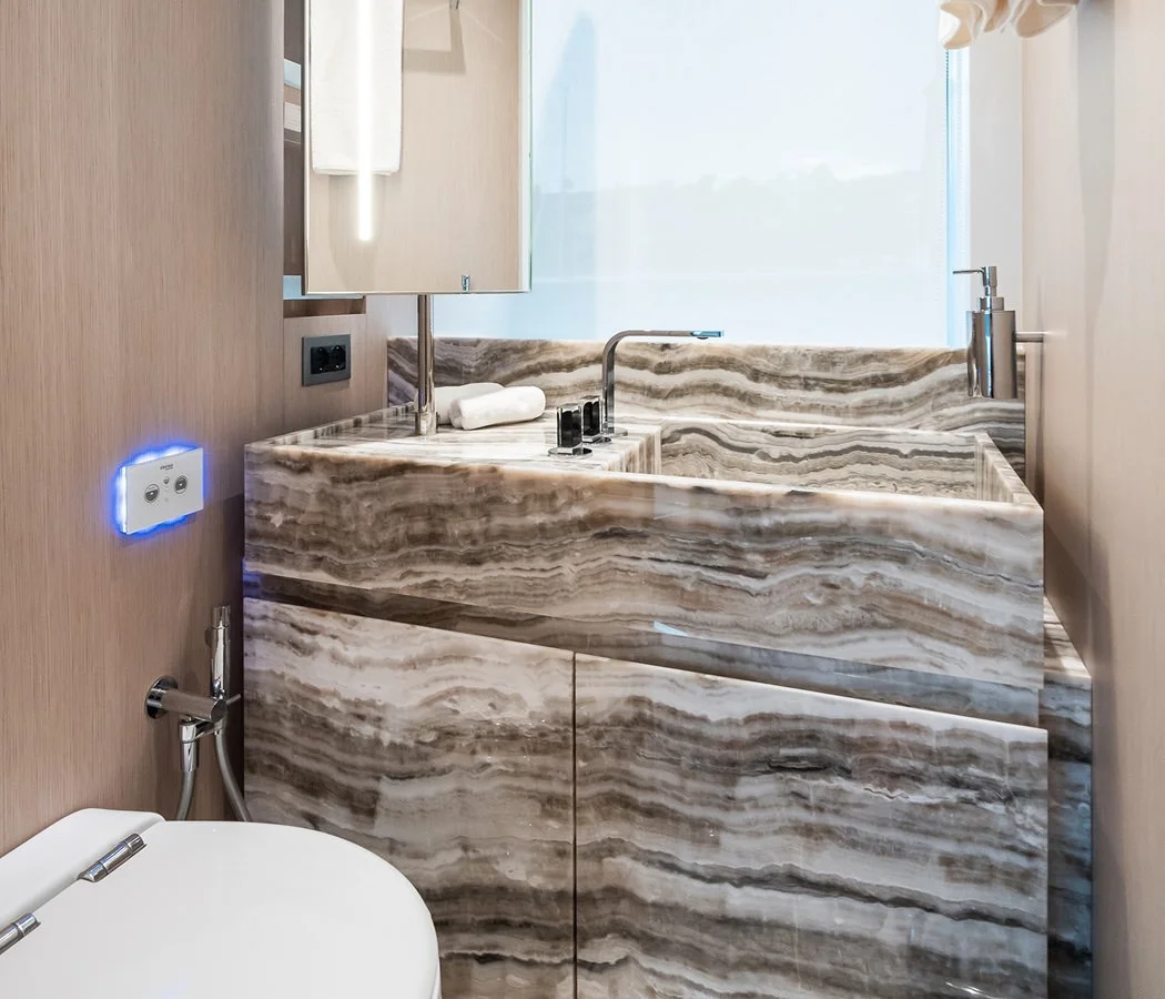 Ami’s guest accommodations exude luxury, with four cabins designed to comfortably host up to nine guests, plus crew quarters for five. The lower deck features a spacious master suite, complete with a large walk-in closet and en suite. Two VIP staterooms, with a twin cabin in between, each have their own en suite facilities. At the heart of it all, a stunning staircase links all the decks.
