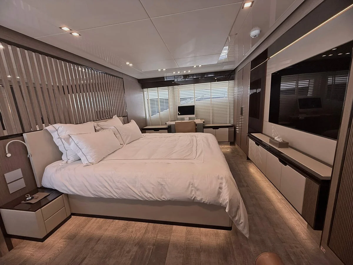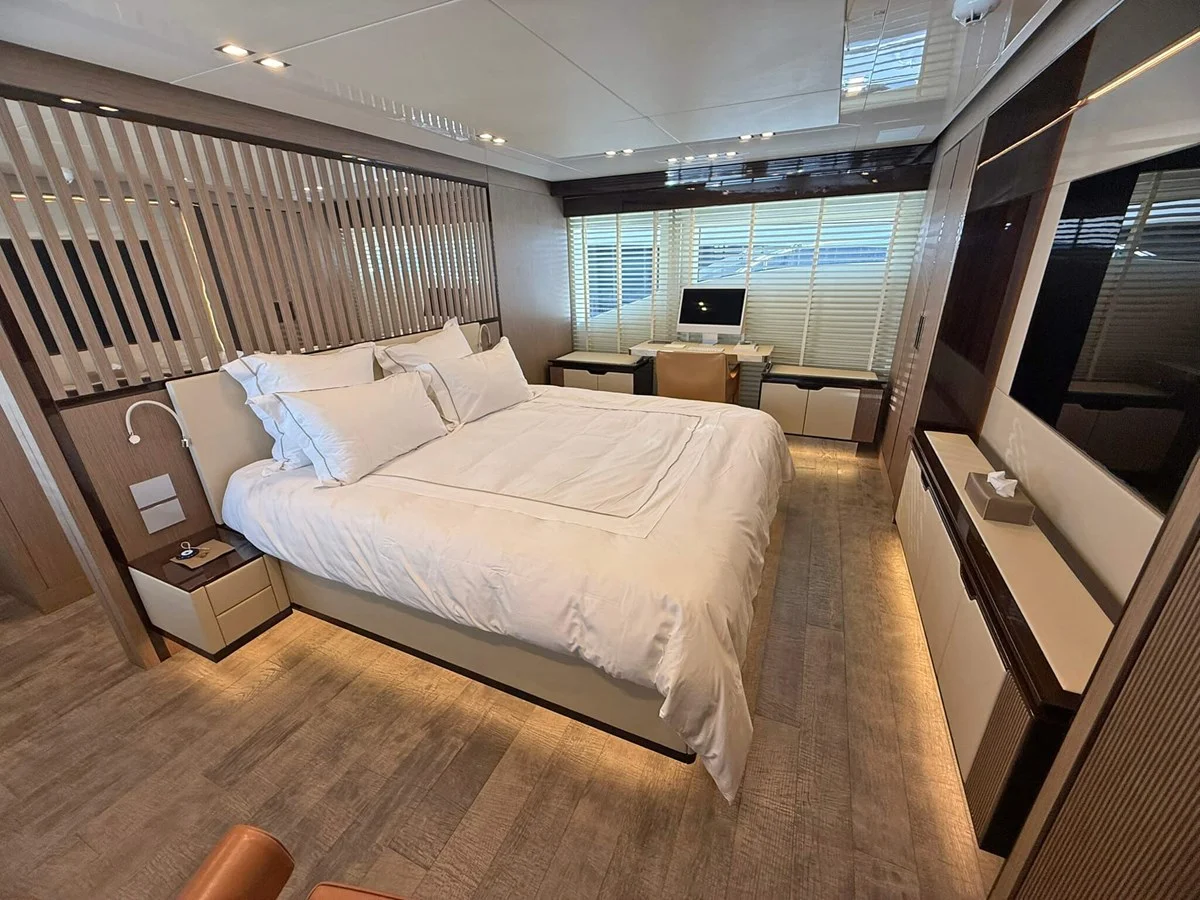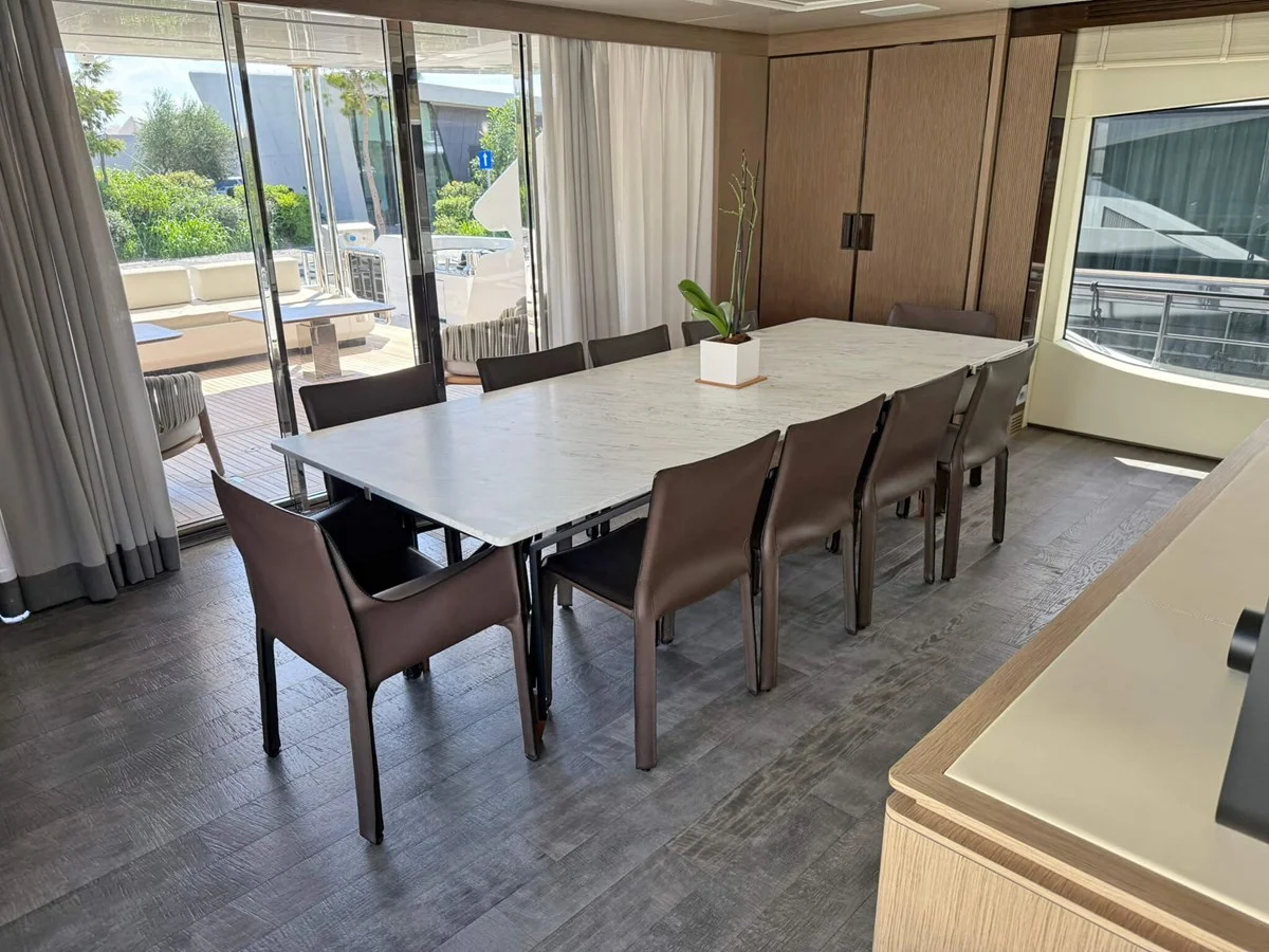 Maiora 30 Walkaround (2024), a 30.5-meter motor yacht that redefines luxury, elegance, and performance. With a sleek walkaround design, this yacht boasts full ceiling-to-floor windows, flooding the interior with natural light while offering stunning panoramic sea views. Accommodating up to 10 guests in 5 opulent cabins and 5 bathrooms, plus 3 crew cabins for up to 5 crew members, the layout ensures both comfort and privacy. The master cabin is conveniently located on the main deck, while 2 VIP cabins and 2 guest cabins are found on the lower deck, providing a spacious and versatile sleeping arrangement for guests.The yacht’s technical excellence is underscored by its powerful propulsion system, driven by twin MAN V12-2000 engines, each delivering 2000hp, paired with ZF V-drive gearboxes. This configuration allows for a maximum speed of 22 knots and a cruising speed of 19 knots. Onboard systems are powered by two KOHLER generators, each with a capacity of 45 kW, ensuring smooth operation of all essential equipment..With a beam of 7.5 meters and a draught of 2.1 meters, the yacht offers generous interior volume, totaling an approximate displacement of 110 tons when fully loaded. Its fuel capacity of 12,500 liters and water capacity of 3,000 liters ensure extended cruising without the need for frequent stops.Every element of the Maiora 30 Walkaround (2024) reflects a commitment to luxury, innovation, and seaworthiness. This like-new yacht presents an exclusive opportunity for discerning buyers seeking a ready-to-sail vessel of the highest caliber.