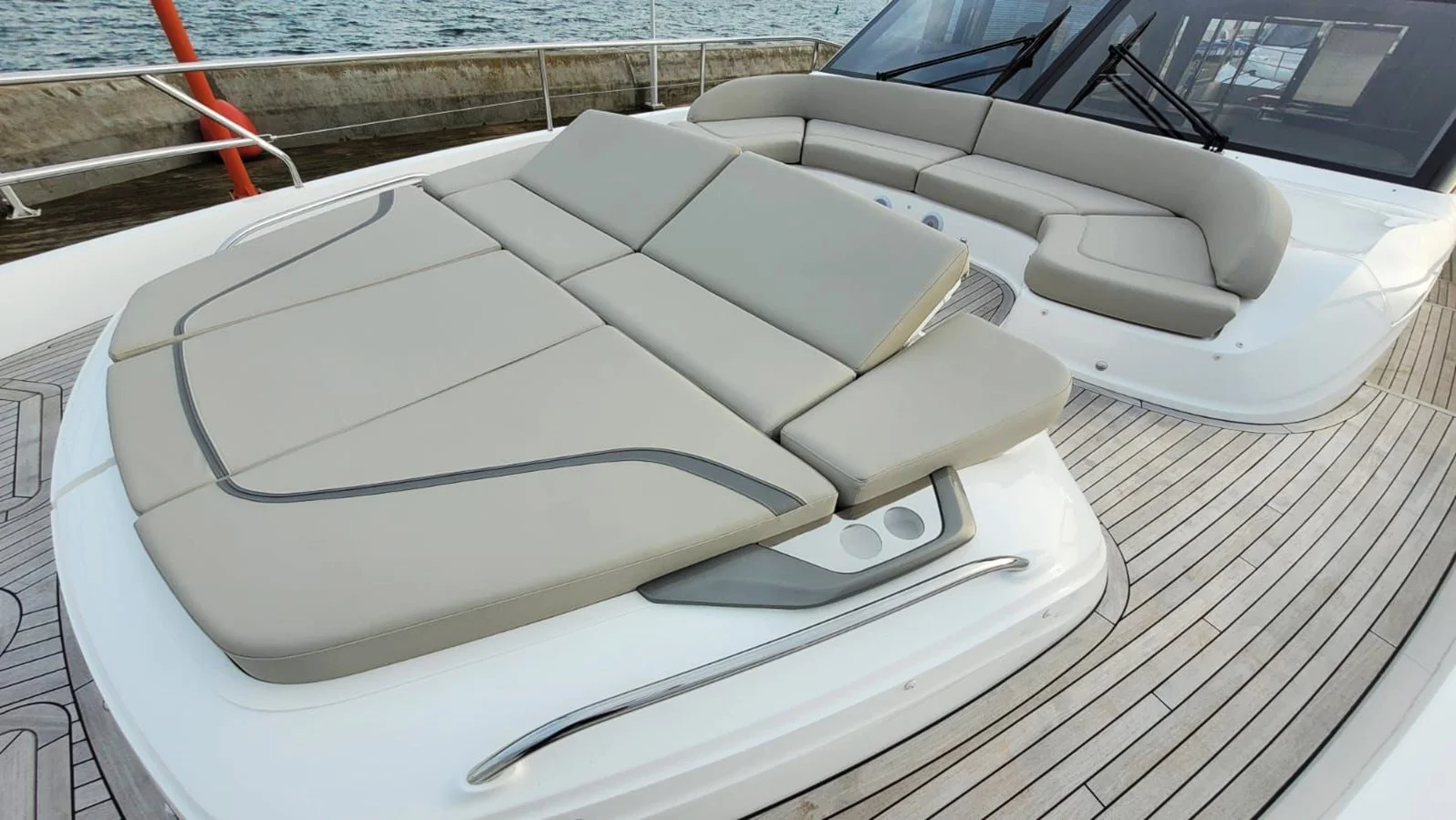 Foredeck teak coffee table, shower on bathing platform