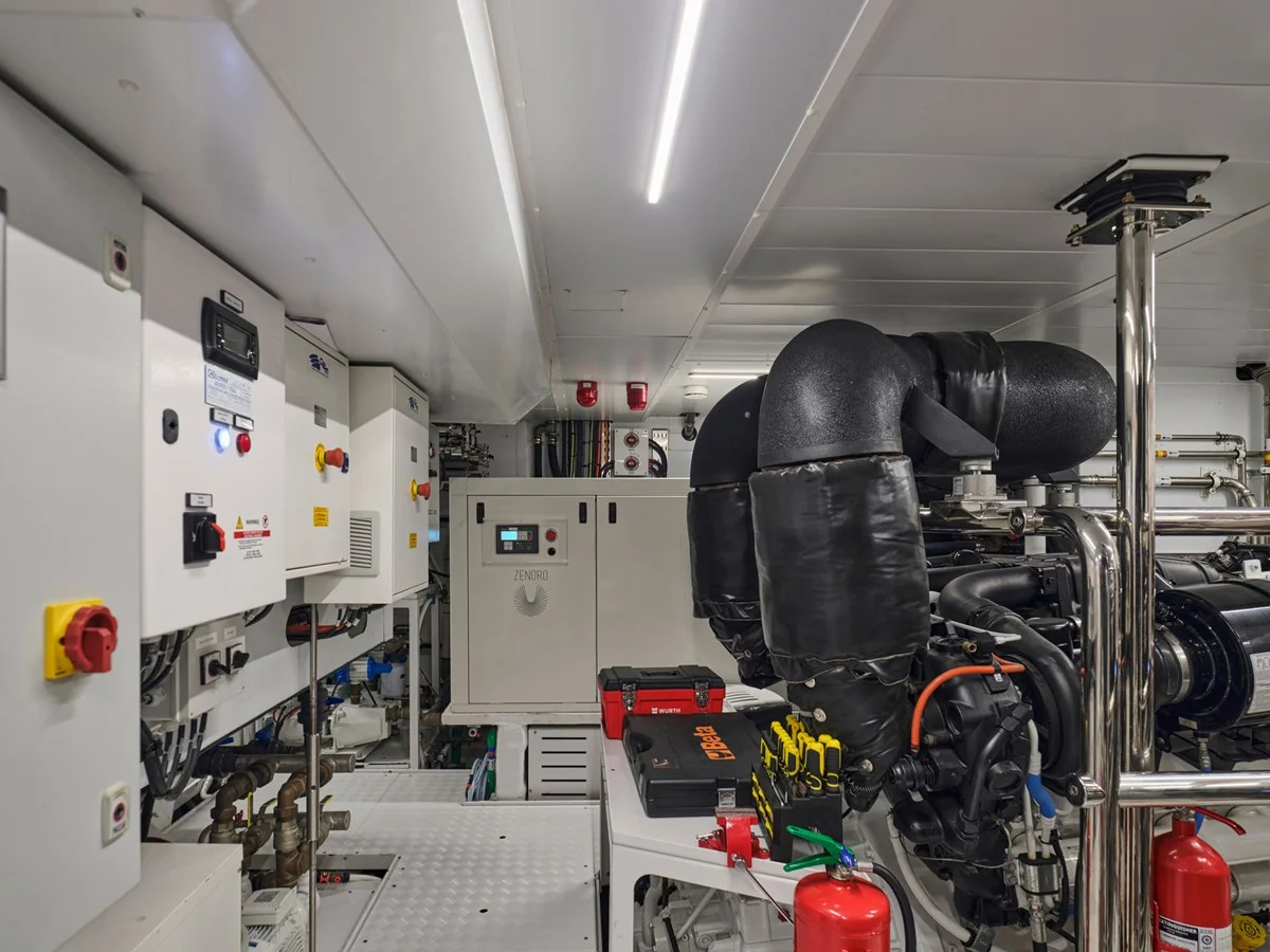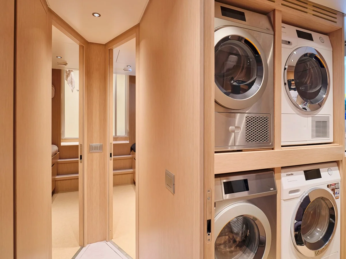 Accommodating 11 guests in five luxurious ensuite cabins, she offers refined interiors and standout features such as openable side balconies at the Beach Club — transforming life on the water into an unforgettable all-day experience. Powered by twin CAT C32 ACERT diesel engines of 1,622 hp each, she cruises comfortably at 14 knots, reaches a top speed of 19 knots, and boasts an impressive range of 2,500 nautical miles at an economical speed of 11 knots.