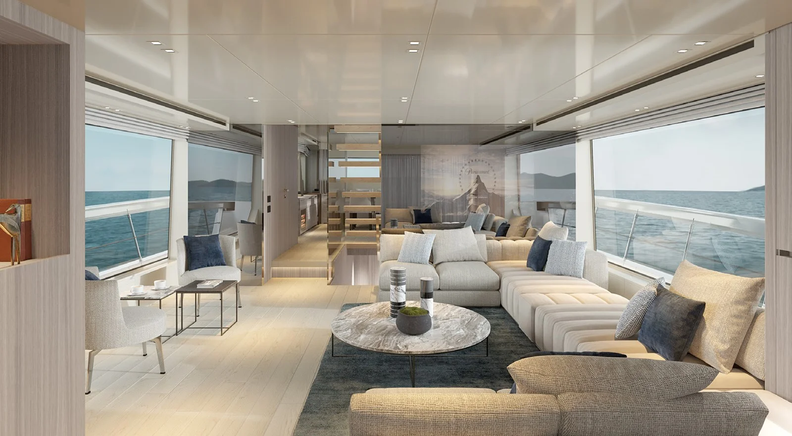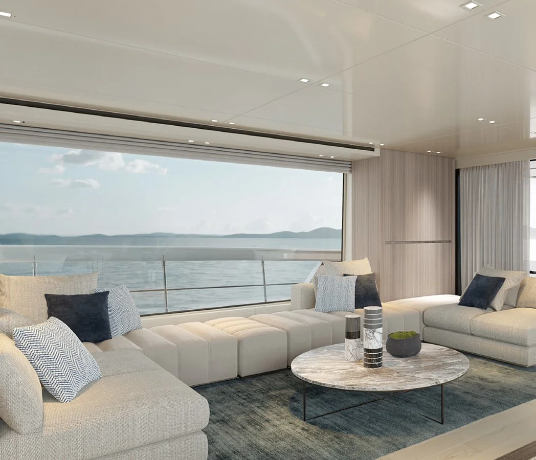 Inside, the main saloon is a sanctuary of style, featuring elegant sofas and armchairs, soft rugs, and curated coffee tables, all bathed in natural light through large windows. The adjacent dining area, with a polished marble table and comfortable chairs, invites leisurely meals and convivial evenings. Thoughtful touches, such as subtle lighting, gentle soft furnishings, and smooth transitions to exterior spaces enhance every moment onboard.