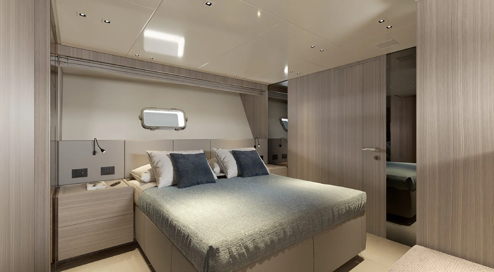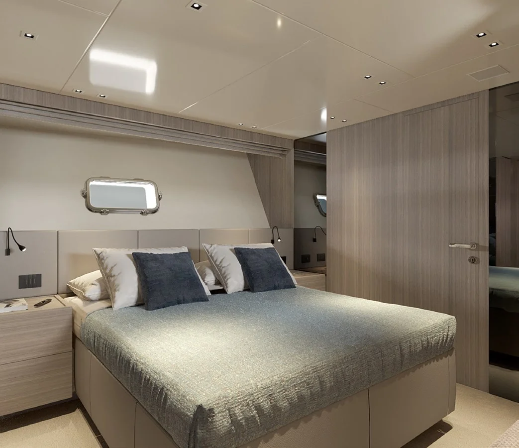 Four thoughtfully designed cabins are located below deck, the full-beam owner’s suite is a serene retreat, complete with a king-size bed, sofa, vanity, and ample natural light from large portholes. The remaining three cabins comprise a VIP suite and two twins, providing flexible sleeping arrangements with ensuite bathrooms and luxurious finishes, while dedicated crew quarters ensure discreet, attentive service.