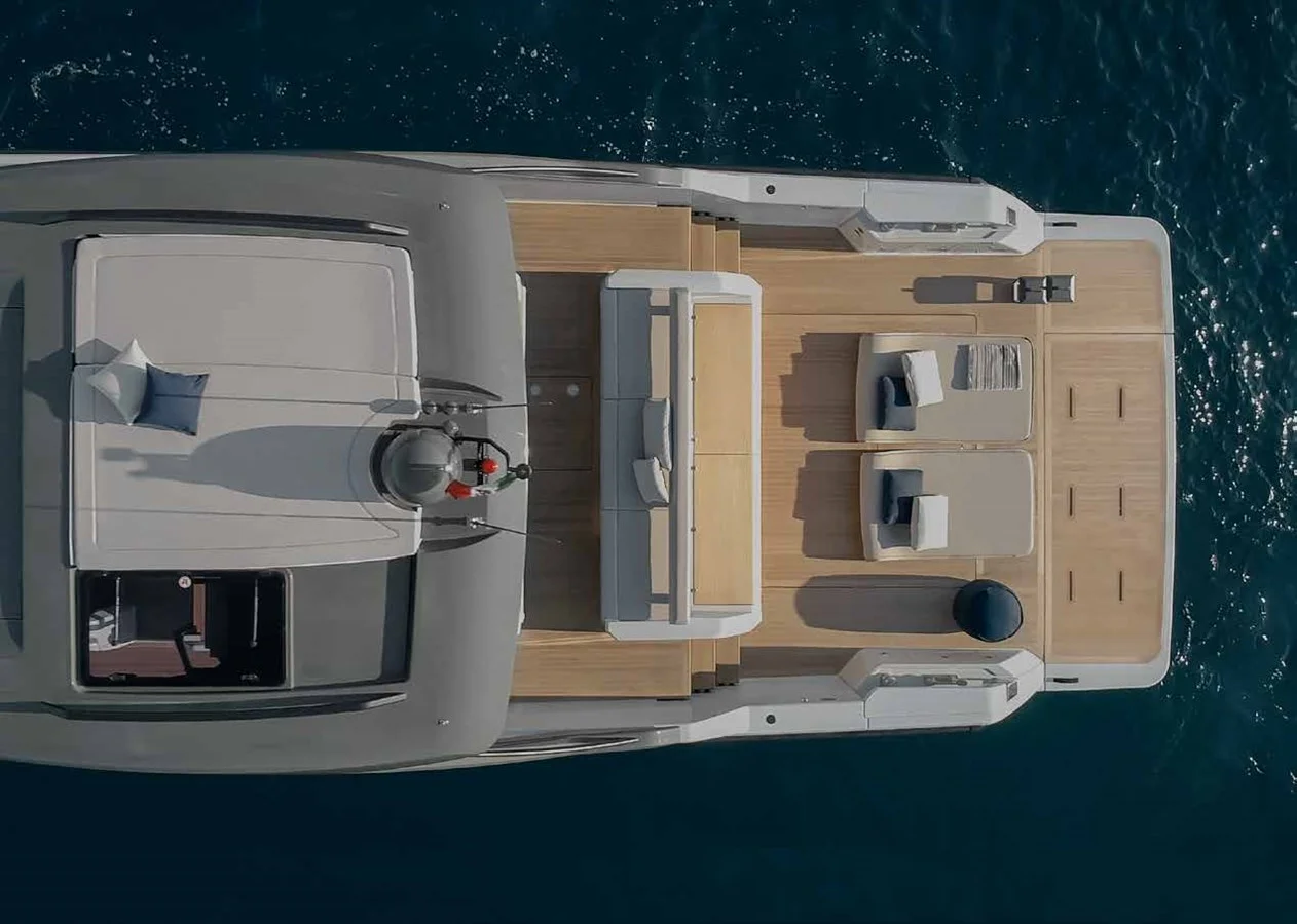 At the stern, the spacious beach club opens out to a versatile platform, ready to launch a tender or for effortless ocean access. Up front, the bow lounge area offers an inviting escape with deep seating and a generous sunpad, the perfect spot to unwind or entertain in style.