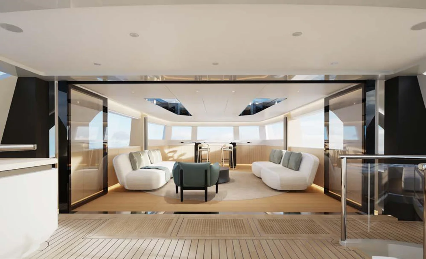 Among the most notable layout features is the partially enclosed sun deck, which houses a third salon, an ideal space for observing nature and wildlife in colder climates, or for hosting private gatherings at the highest point of the vessel.