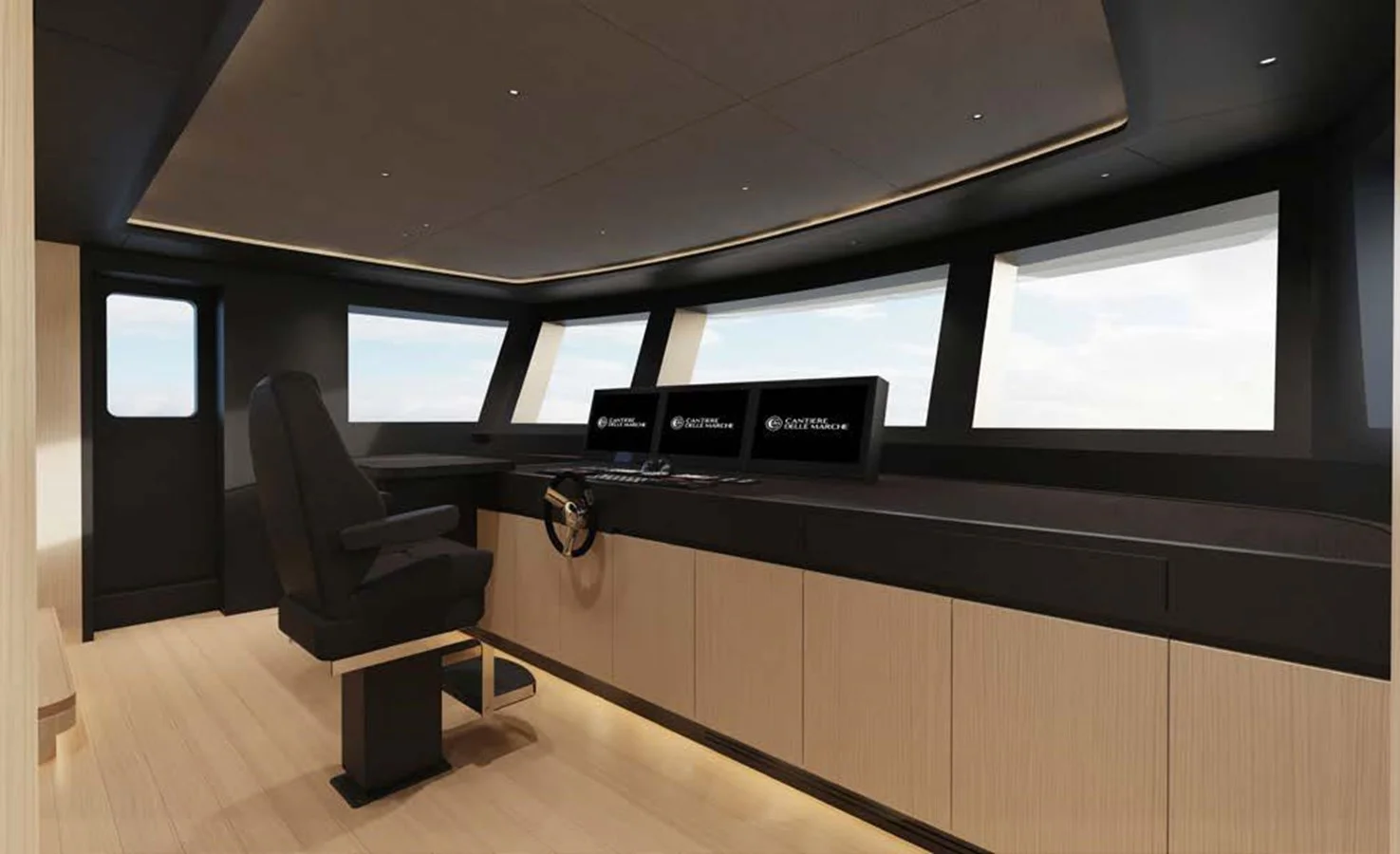 Interiors by Giorgio Cassetta capture the essence of timeless Italian luxury. Warm tones, natural textures, and generous glazing create a refined atmosphere where guests can unwind in comfort. The yacht accommodates 12 guests in five staterooms, including a full-beam owner’s suite on the main deck, two double cabins, and two twin cabins with Pullman beds. A crew of seven is housed in three separate cabins with independent access routes, ensuring discretion and privacy for guests at all times.